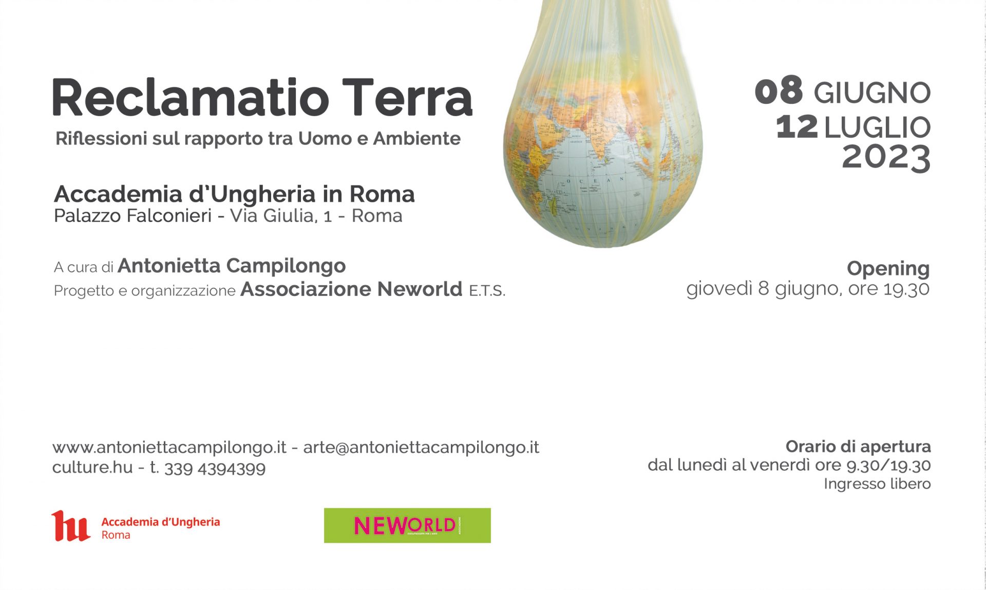 A seguito del successo della mostra “Sotto i Raggi del Sole”, svoltasi lo scorso mese di ottobre presso la Villa di Massenzio e il Mausoleo di Romolo, un nuovo progetto espositivo, “Reclamatio Terra. Riflessioni sul rapporto tra Uomo e Ambiente”, dedicato anch’esso al tema del futuro del pianeta e alla necessità di costruire un nuovo rapporto Uomo/Natura, per riflettere sul problema del cambiamento climatico con una particolare attenzione agli oceani in occasione del "World Oceans day” dell’8 giugno. La collettiva verrà ospitata presso il Piano Nobile di Palazzo Falconieri, sede dell’Accademia d’Ungheria in Roma, da giovedì 8 giugno (vernissage ore 19.30) a lunedì 12 luglio 2023. La mostra, a cura di Antonietta Campilongo con testi di Alice Straffi e promossa dall’Associazione Neworld ETS, che conta 28 artisti e circa 40 opere esposte, è visitabile dal lunedì al venerdì, dalle 9.30 alle 19.30.