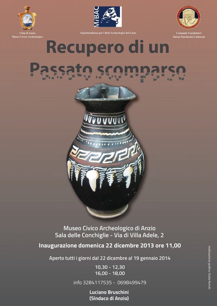 La mostra dal titolo: Recupero di un Passato Scomparso, curata dalla Soprintendenza per i Beni Archeologici del Lazio, il Comando Carabinieri Tutela Patrimonio Culturale e il Museo Civico Archeologico di Anzio, si prefigge lo scopo di restituire e valorizzare un patrimonio archeologico sottratto illecitamente attraverso modalità e tempi diversi alla nostra eredità culturale. L’interessante mostra, unica nel suo genere, offre a tutti una insolita opportunità di conoscere storie affascinanti che soltanto i materiali archeologici, di rara bellezza, riescono a raccontare, opportunità nate dall’impegno profuso dal Comando Carabinieri Tutela Patrimonio Culturale che da anni vigila e tutela il nostro territorio.