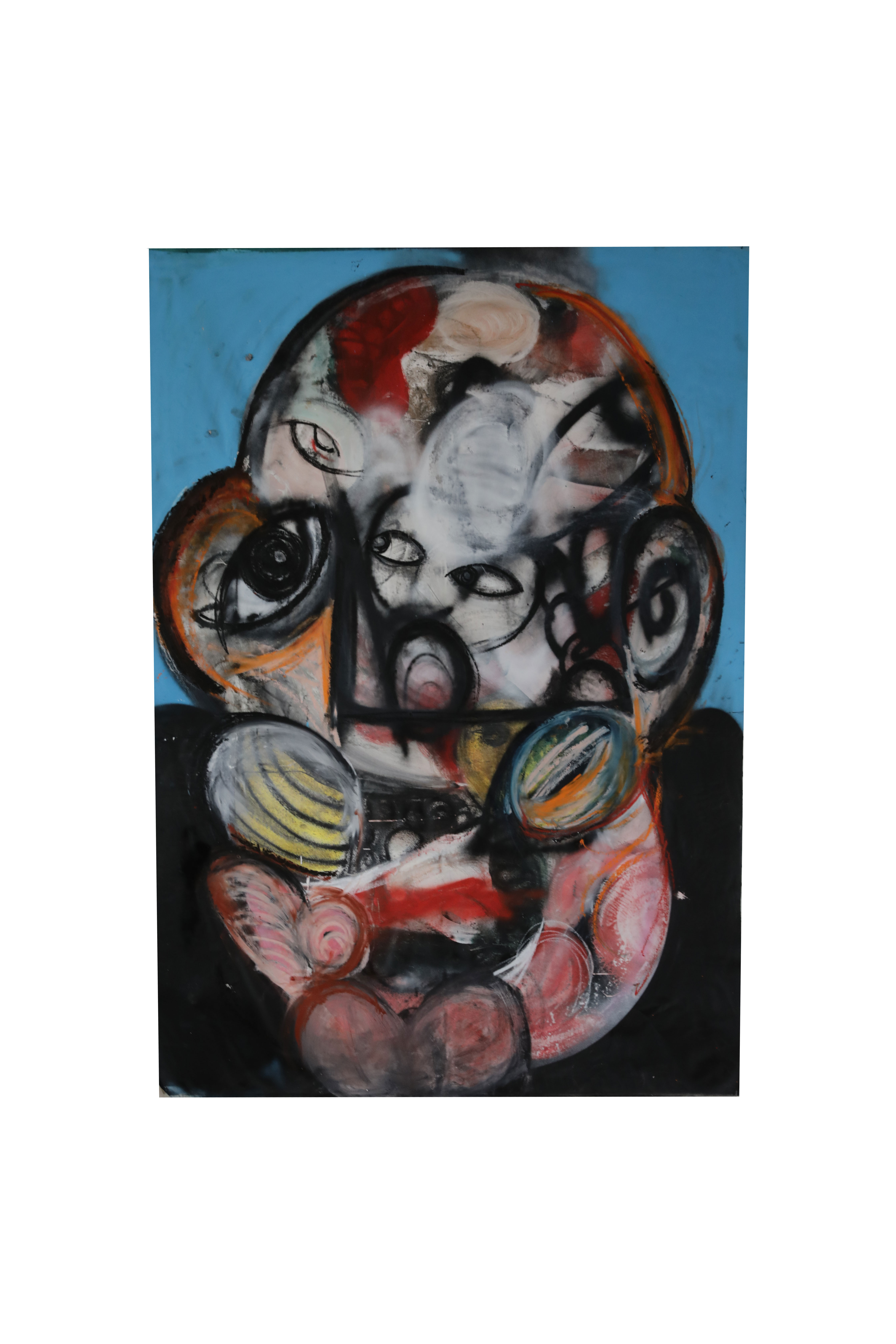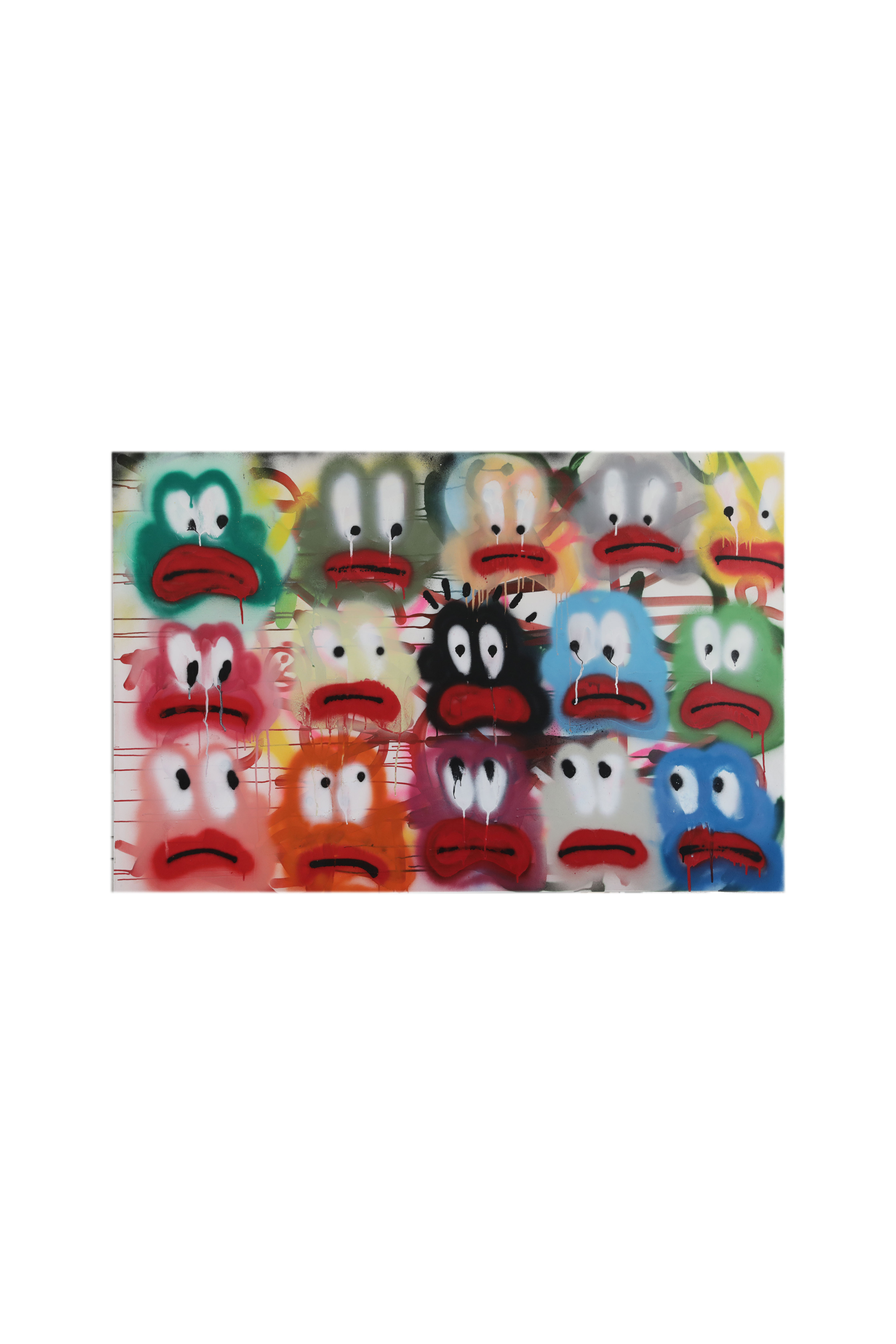 “C’è un volto che ritorna, ossessivo e familiare, in ogni opera di Redlongo. Una maschera stilizzata, quasi infantile: testa rotonda, occhi spalancati, quattro capelli sparati verso l’alto. Sembra un disegno fatto in fretta su un quaderno, un logo, un’icona pop. Ma è molto di più. È un simbolo identitario. È un autoritratto spirituale. È il frutto di una trasformazione dolorosa.”