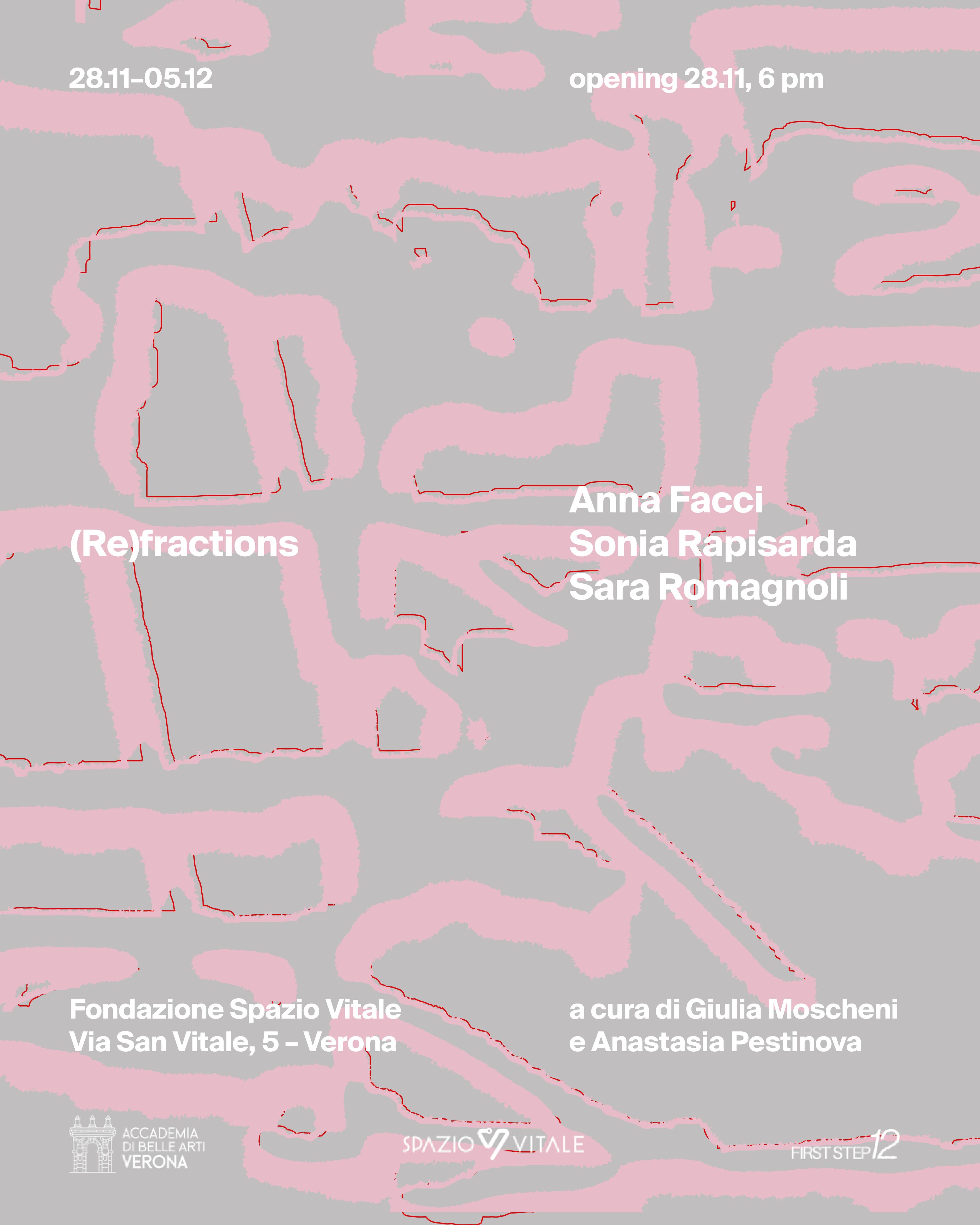 (Re)fractions, la mostra di Anna Facci, Sonia Rapisarda e Sara Romagnoli a cura di Giulia Moscheni e Anastasia Pestinova, si terrà presso Fondazione Spazio Vitale (Via San Vitale 5, Verona) dal 28 novembre al 5 dicembre 2025, con inaugurazione venerdì 28 novembre alle ore 18.00. L’esposizione nasce nell’ambito del progetto First Step, in collaborazione con l’Accademia di Belle Arti di Verona.