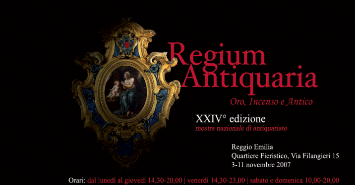 “Regium Antiquaria - Oro, Incenso & Antico”, XXIV° Mostra nazionale d'Antiquariato, si terrà dal 3 all'11 novembre 2007 presso il Quartiere Fieristico di Reggio Emilia (via Filangieri 15), organizzata da Eventi Culturali.