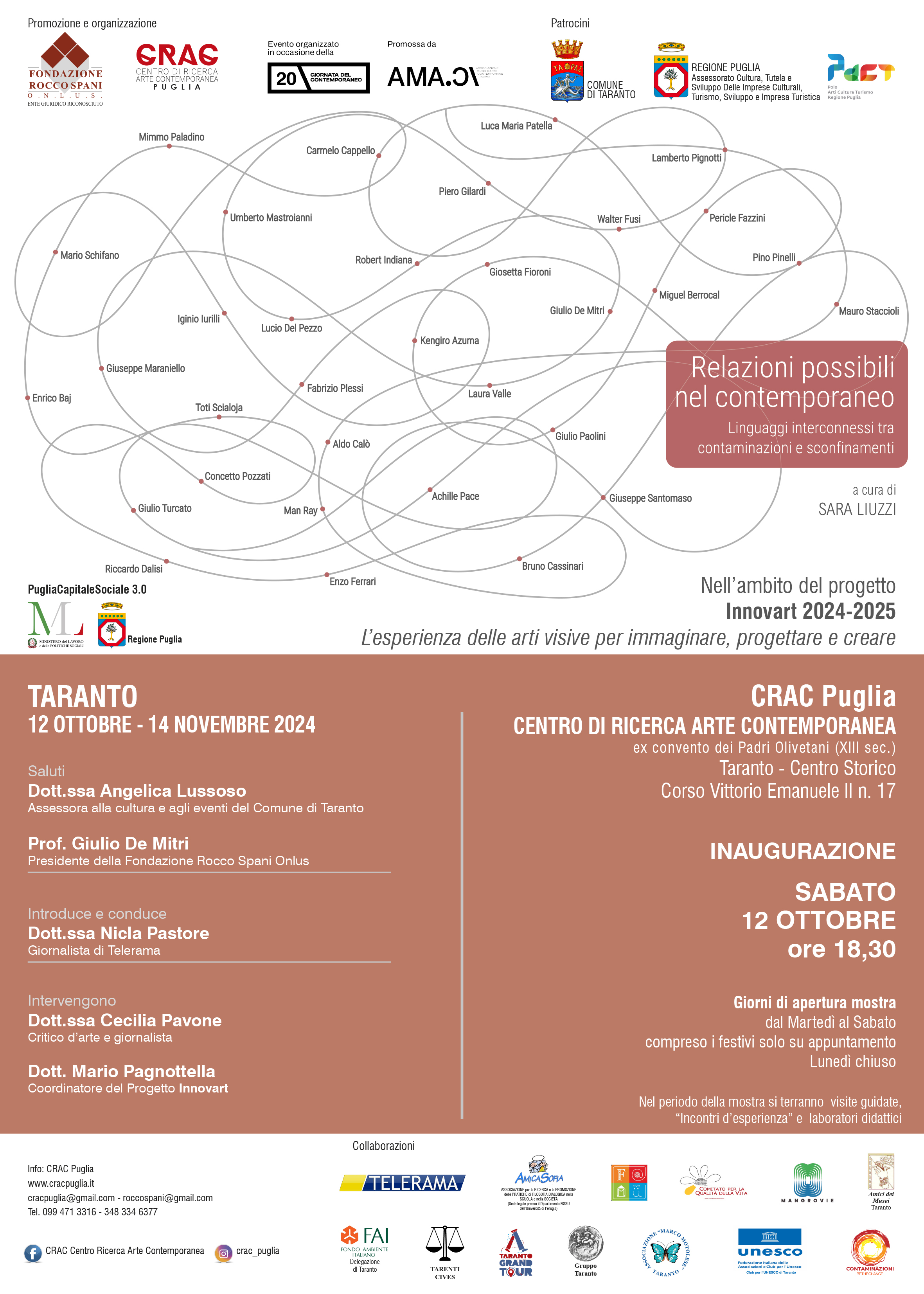 Per la Ventesima Giornata del Contemporaneo, promossa da AMACI (Associazione dei Musei d'Arte Contemporanea Italiani), sabato 12 ottobre p.v. alle ore 18.30 il CRAC Puglia (Centro di Ricerca Arte Contemporanea) della Fondazione Rocco Spani Onlus inaugurerà - nell'ambito del progetto Innovart 2024-2025: l'esperienza delle arti visive per immaginare, progettare e creare - la mostra “Relazioni possibili nel contemporaneo. Linguaggi interconnessi tra contaminazioni e sconfinamenti”.