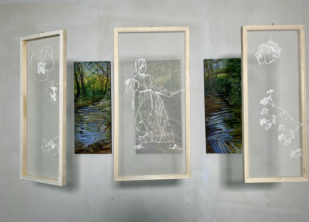 Nella sua doppia veste di curatrice ed artista, Constanza Villarreal ci presenta il suo ultimo lavoro presentato “Acqua Dolce” realizzato su tessuti di recupero, partendo dal paesaggio circostante per ritrarre il flusso dinamico della vita, consentendo al senso di decadimento dei materiali di recupero di intrecciarsi nella composizione visiva. Stratificato nella narrativa visiva, c’è un invito continuo ad abbracciare la trasformazione e vedere la bellezza in tutte le fasi che ne derivano.