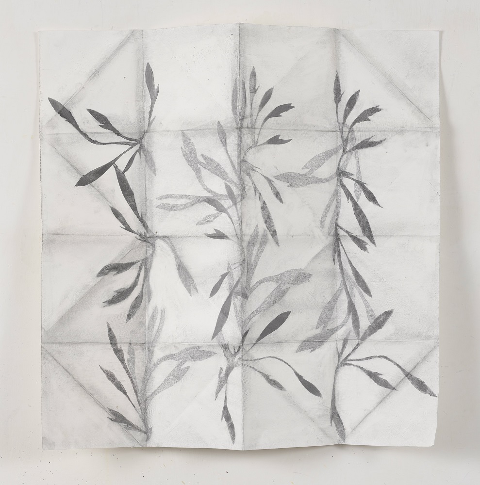 Altri artisti esplorano i processi organici, come i disegni a matita su carta modellata di Carolyn Angus, che dialogano con il paesaggio circostante dell’Appia Antica.