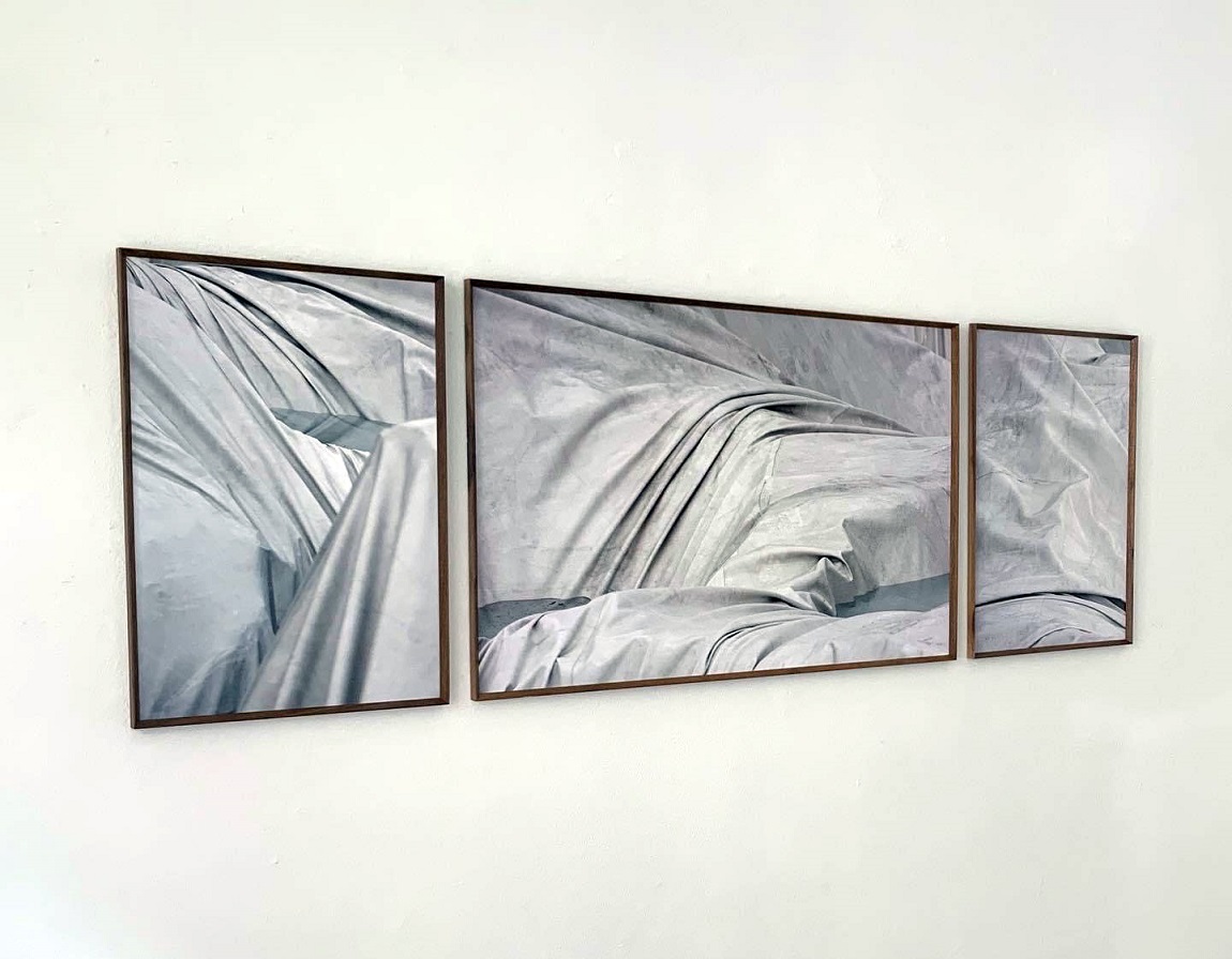 La fragilità è anche in mostra nelle grandi fotografie di Claudio Orlandi: tessuti simili alla pelle che ricoprono ghiacciai monumentali per impedirne il loro scioglimento.