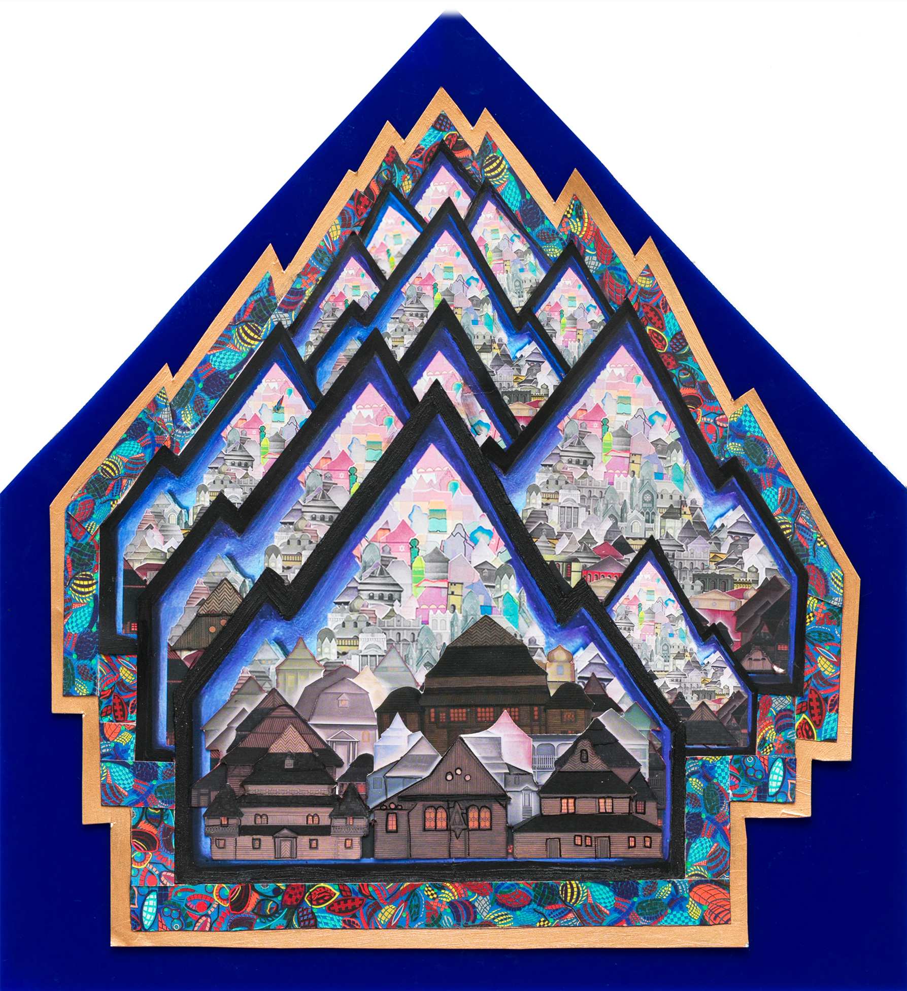Un argomento che l’artista ha deciso di trattare non solo per ragioni personali – alcuni membri della sua famiglia sono stati vittima dell’Olocausto – ma anche, e forse soprattutto, per dare di nuovo dignità e bellezza a ciò che il disprezzo e l’insensatezza umana hanno cancellato. «Le opere in mostra parlano dei bei tempi esistiti per centinaia di anni» dichiara Cooper che aggiunge «sono immagini gioiose che hanno la forma di sinagoghe non più esistenti per ricordare che in questi luoghi le comunità si ritrovavano per pregare, sposarsi, festeggiare varie ricorrenze, celebrare funerali. Insomma, erano centri di aggregazione pieni di vita». Parole che ben esemplificano il senso di un progetto artistico il cui sguardo retrospettivo assume valore non solo perché recupera il passato, ma ancora di più perché gli restituisce una fisionomia, al tempo stesso, uguale e diversa da quella che è stata. Se da un lato, infatti, le sue opere ricostruiscono nel profilo l’aspetto originario delle sinagoghe – spesso replicandolo più volte o da più punti di vista per ottenere delle composizioni multiple –, dall’altro lato queste forme fungono da “finestre” oltre le quali si affaccia un paesaggio insieme astratto e reale, ottenuto con la ripetizione e l’accostamento di pattern ora geometrici ora naturali ora architettonici, in modo da creare una texture armonica, variopinta, dinamica, che alterna colore dipinto a materiali come carta e plastica.