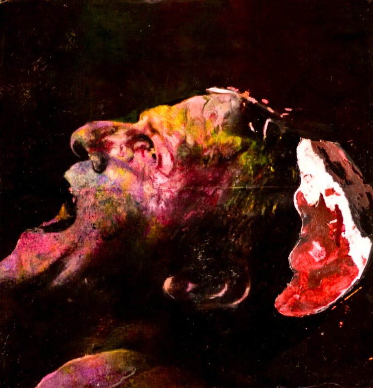 Oltre l’inganno della distinzione stessa tra “dentro” e “fuori”, che, nelle parole di Punzo, in realtà “aiuta tutti i personaggi a restare chiusi nel proprio ruolo per sempre”, nel dialogo tra polittici monumentali e piccoli gioielli pittorici, l’espressionismo spinto fino alle estreme conseguenze, rompe con una condizione, si tinge di raffinate colature rosse informali, e la dinamica si accentua, in urla reciproche, irrisolte fra interpretazione magistrale e disumano sacrificio, fissato e amplificato, da schiaccianti incursioni di inedita materia.