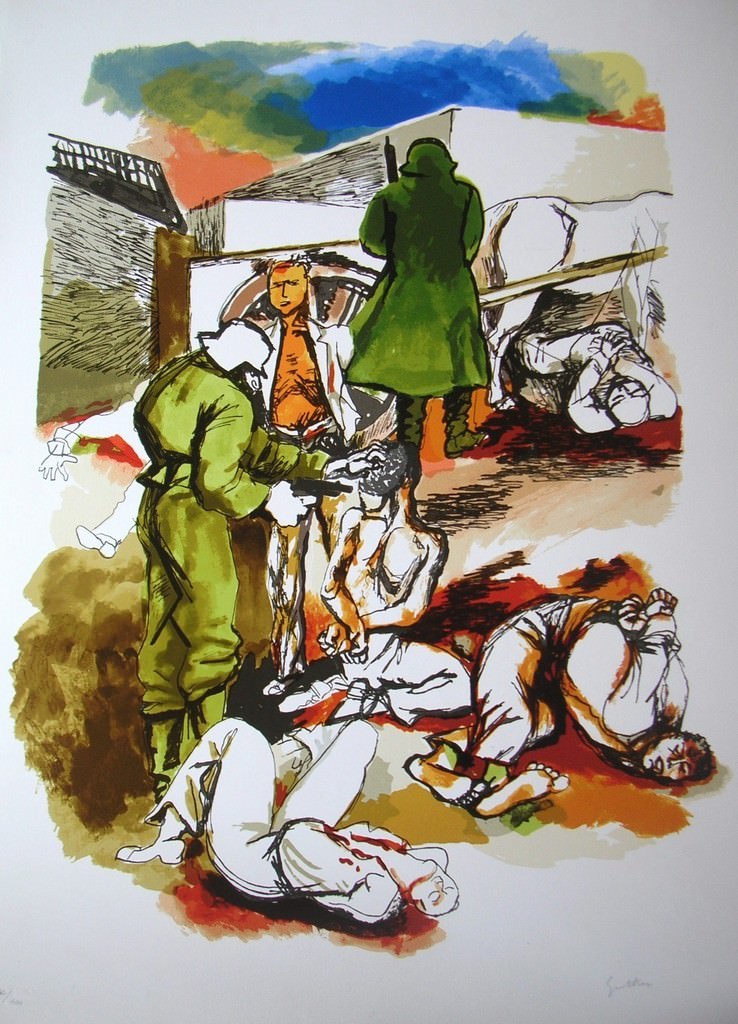 Con un segno forte, di grandissimo realismo e capacità evocativa, Guttuso ha rappresentato i torturati, i fucilati, i civili impiccati e passati per le armi insieme ai “ragazzi della montagna”, i soldati delle stragi, la rivolta degli uomini liberi. Il “segno” di Guttuso, come in tutte le notissime opere successive, rende davvero inconfondibile e straordinaria tutta la ricerca realista del maestro.