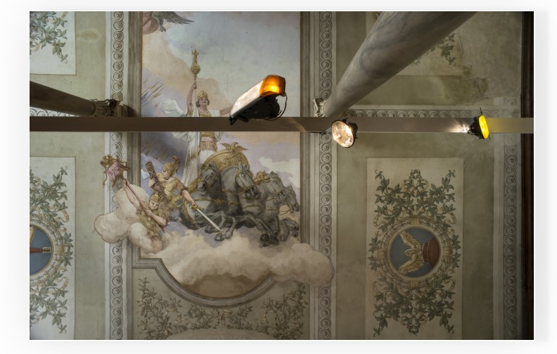 Partendo dai dettagli architettonici e artistici delle sale della Residenza Sabauda, l’opera di Leotta crea un percorso immaginario negli spazi del Museo in cui i fasti del passato settecentesco sabaudo espressi nei motivi araldici, nelle decorazioni e negli affreschi, sono metaforicamente illuminati dai fari delleautomobili.