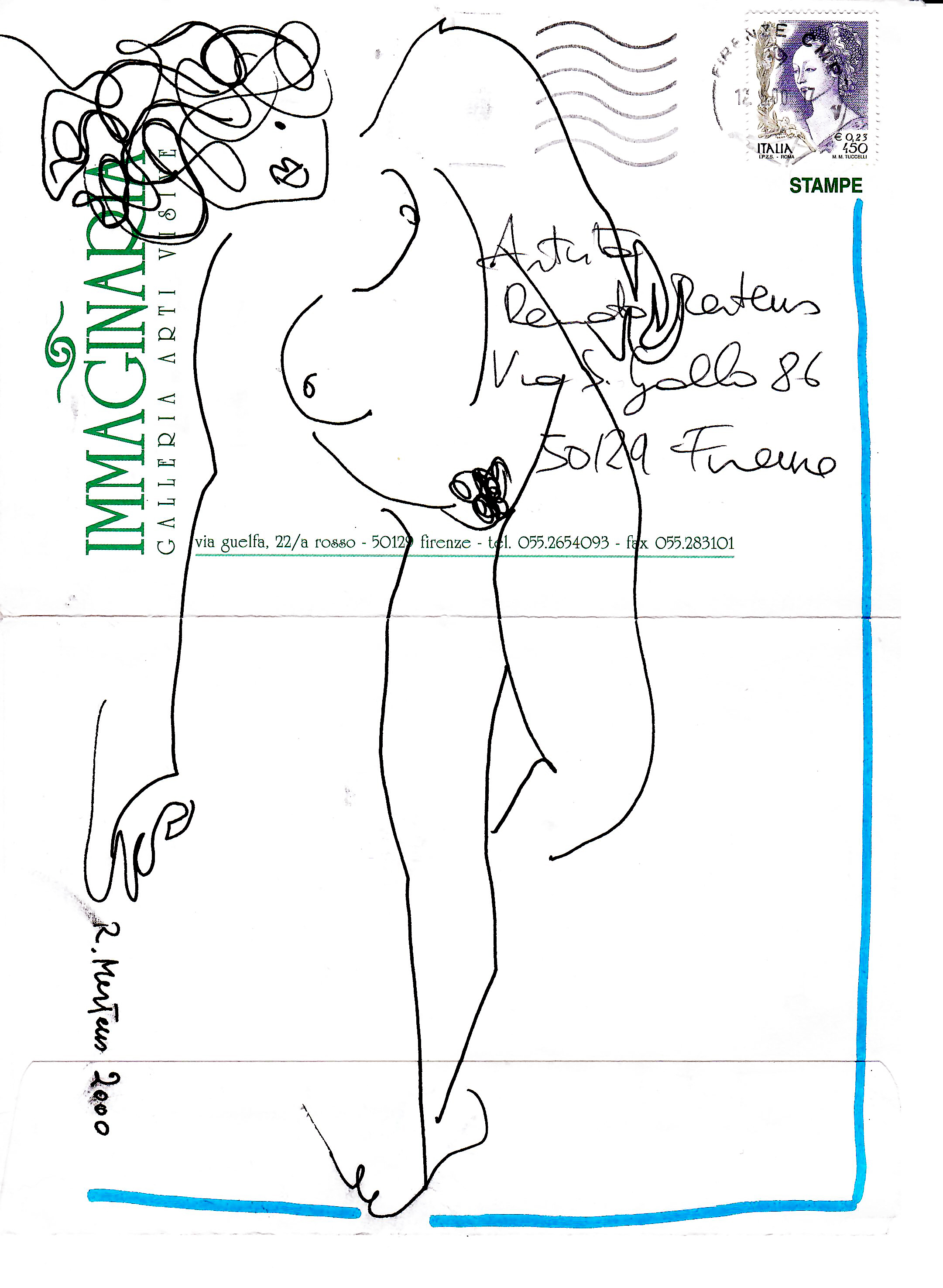 Catturare velocemente i contorni, tracciarli sull’ultima busta arrivata con il francobollo ancora umido, per riuscire a fermare il pensiero di Lei prima che svanisca. Questo alfabeto di figure femminili, amate o sognate, appartiene a Renato Mertens.