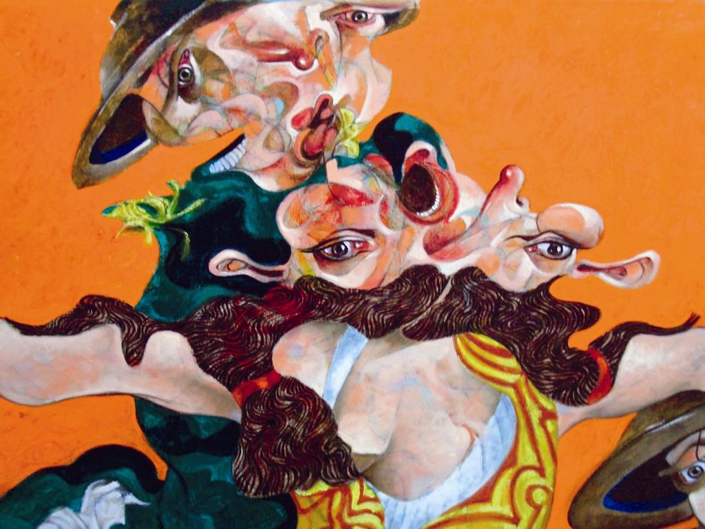 Nel caos che affiora dallo sfondo alloggiano immagini spesso ingigantite: volti, mani, oggetti in una scomposizione analitica che rimanda a copiosità di idee in un’atmosfera di visionarietà dove l’esasperato soggettivismo che marca il volto scomposto in mille volti mai gli fa perdere di vista il proposito di ascoltare « le voci di dentro». (Caterina Spiga)