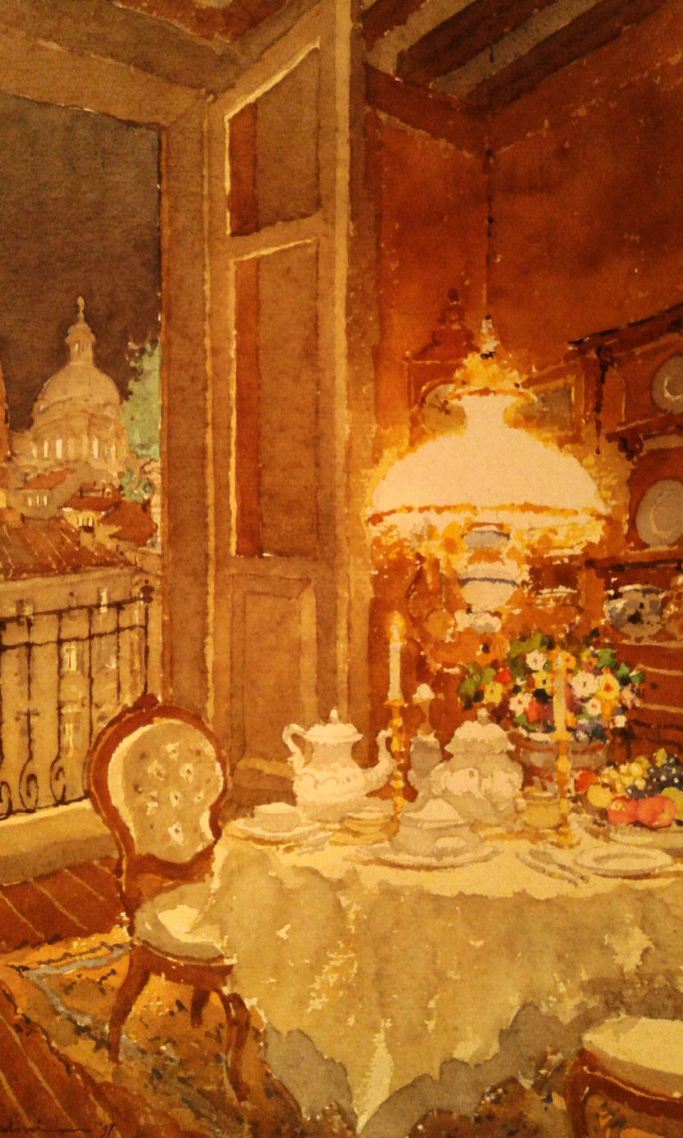 La presenza dell’uomo è sempre avvertibile negli acquerelli di Renzo Ferrarini (1928-2001). Anche nei suoi bellissimi interni. Scenografie preparate ad ospitare la vita: il vino versato nel bicchiere, una tavola apparecchiata, fiori freschi in un vaso o un libro aperto sul tavolo testimoniano presenze.