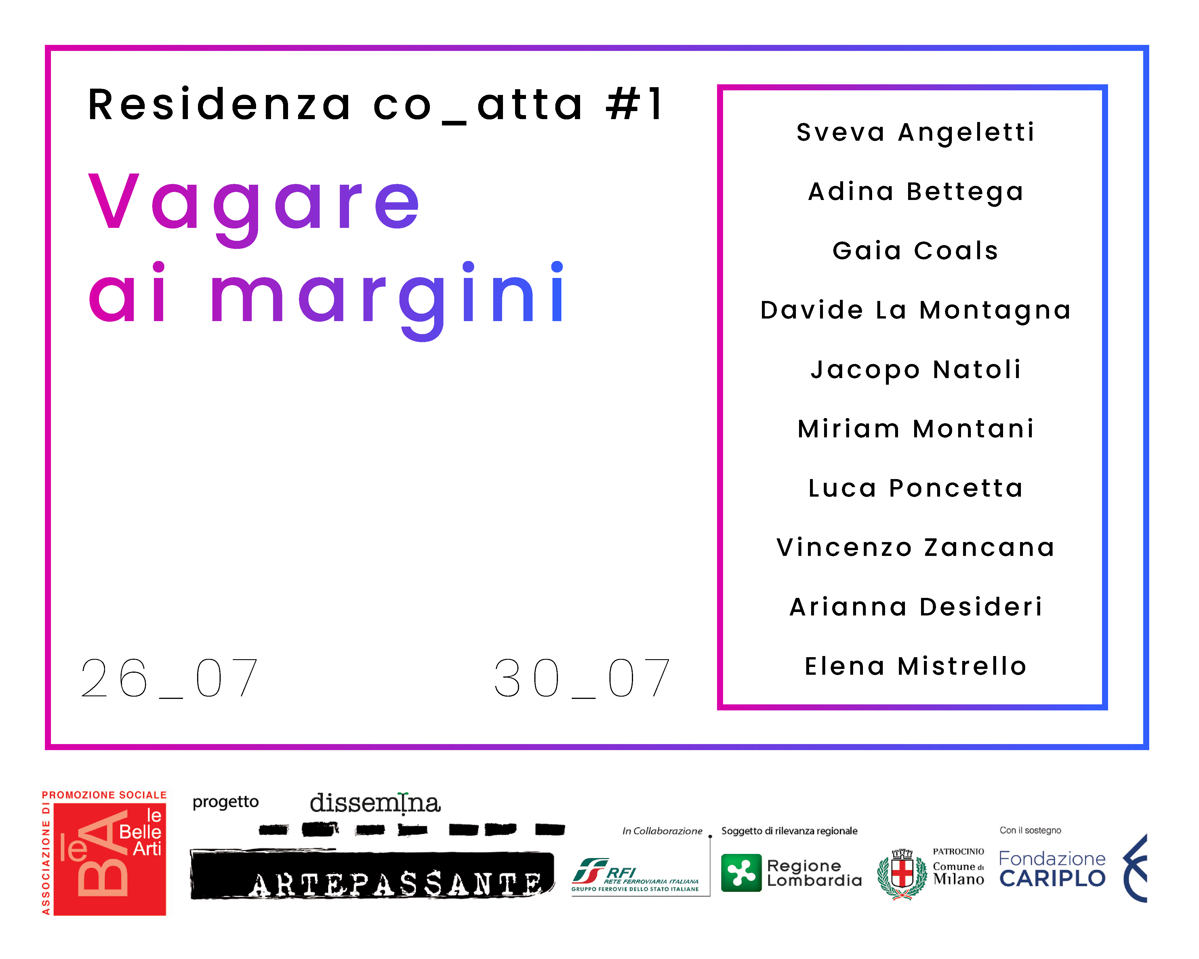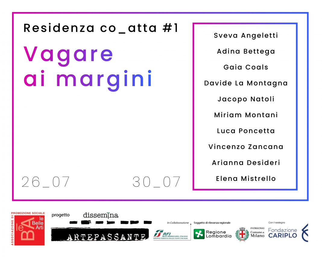 Dal 26 luglio al 30 luglio 2021 presso lo spazio di co_atto si svolgerà “Vagare ai margini”, prima residenza d’artista in vetrina. Sveva Angeletti, Adina Bettega, Gaia Coals, Davide La Montagna, Miriam Montani, Jacopo Natoli, Luca Poncetta e Vincenzo Zancana parteciperanno a questa prima edizione e realizzeranno progetti site-specific sul tema del rapporto con lo spazio e le dinamiche di fruizione.