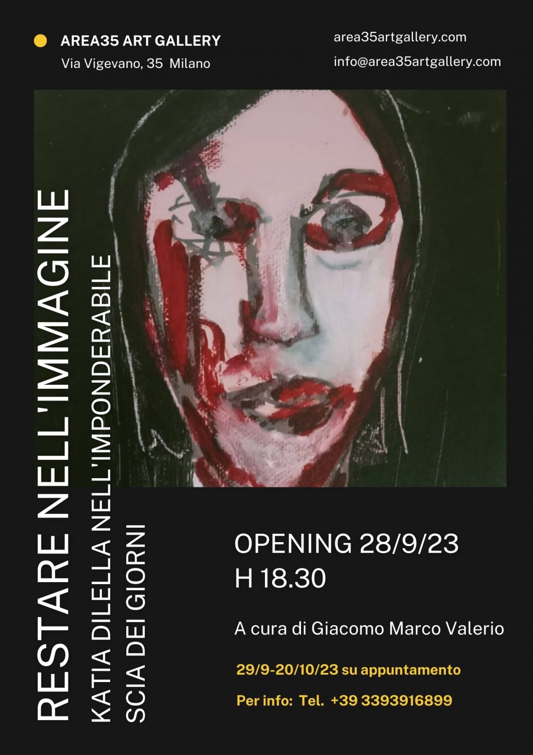 Giovedì 28 settembre alle ore 18.30 inaugura presso Area35 Art Gallery, via Vigevano 35 a Milano, “Restare nell’immagine. Katia Dilella nell’imponderabile scia dei giorni”. La mostra antologica a cura di Giacomo Marco Valerio con testo critico di Michela Ongaretti, ripercorre vent’anni di pittura dell’artista Katia Dilella, accanto ad alcuni esempi della sua ultima produzione.