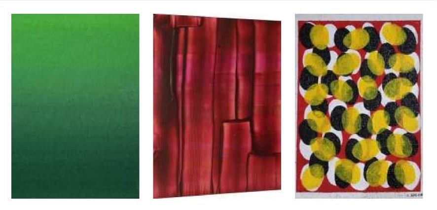 Il colore e lo studio del colore in svariate sue manifestazioni sembra essere il leit motiv di questa esposizione. Colore come modalità pittorica in senso tecnico, ma anche colore come espressione di vitalità e forza.