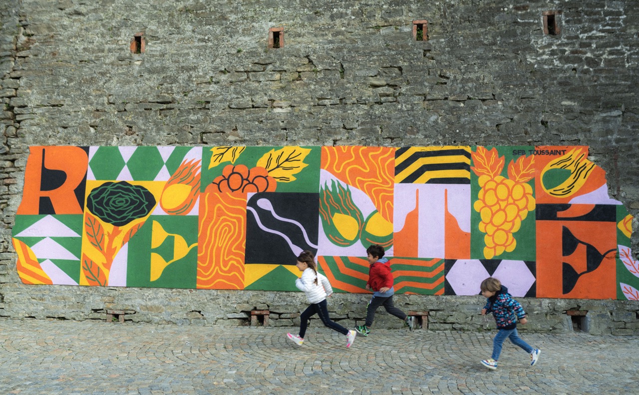 Seb Toussaint ha realizzato opere che parlano a tutti, parole e forme capaci di disvelarsi lentamente, interpretando il territorio nelle sue diverse forme: due murales per gli spazi pubblici di Montelupo, una grande facciata nella piazza Castello affacciata sul belvedere, e per Rodello lungo l’antico muro di cinta del paese. “Resté” e “Munluv” sono le due parole scelte che rimandano al dialetto piemontese e ad altri campi semantici.