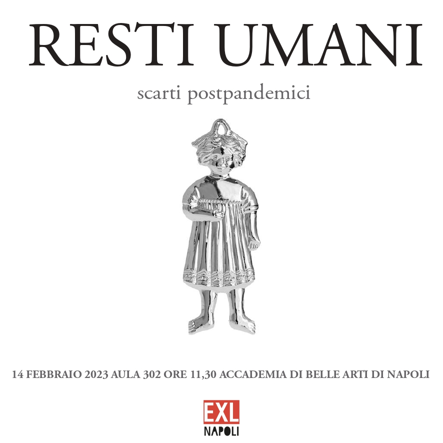 Martedì 14 febbraio 2023, nell’aula 302 dell’Accademia di Belle Arti di Napoli, alle 11,30, verà inaugurata la mostra “RESTI UMANI-scarti postpandemici”. L’evento è la mostra di fine semestre degli studenti del corsi di EXTRALAB NAPOLI, laboratorio di Pittura e Tecniche Extramediali dell’Accademia condotto dal Prof.Rino Squillante e del corso di Anatomia Artistica della Prof.ssa Germana Tempesta.