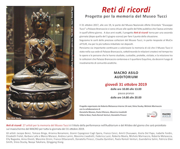 Il progetto Reti di Ricordi, dopo la giornata del 5 giugno 2019 al MACRO in cui si sono susseguiti memorie, dialoghi e proposte su ciò che il Museo Nazionale d’Arte Orientale “Giuseppe Tucci” è stato nella sua sede di Palazzo Brancaccio, continua il suo percorso di approfondimento e propone, a due anni esatti, il 31 ottobre 2019, una seconda giornata di lavoro. Infatti, da un lato si vogliono seguire le sorti delle preziose collezioni del Museo Tucci, solo in parte riesposte al MuCiv, ma per lo più ancora imballate nei depositi; dall’altro è importante continuare a valorizzare la memoria di ciò che il Museo Tucci è stato nella sua sede di Palazzo Brancaccio, ricordando la rete di relazioni creatasi nel tempo (dal 1957 al 2017) tra le opere e le persone che in quella sede le hanno studiate, custodite, protette, visitate, e le relazioni tra le collezioni ospitate a Palazzo Brancaccio e il quartiere Esquilino, da decenni luogo di insediamento di comunità asiatiche.