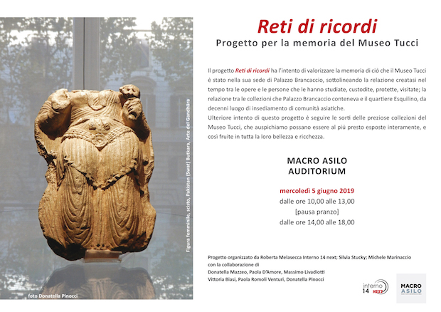 Il giorno 5 giugno 2019 l’Auditorium del MACRO Museo d’Arte Contemporanea di Roma ospiterà il progetto Reti di ricordi Progetto per la memoria del Museo Tucci, a cura di Roberta Melasecca, Silvia Stucky, Michele Marinaccio, con Donatella Mazzeo, Paola D’Amore, Massimo Livadiotti, Vittoria Biasi, Paola Romoli Venturi, Donatella Pinocci: una giornata di memorie, dialoghi e proposte su ciò che il Museo Nazionale d’Arte Orientale “Giuseppe Tucci” è stato nella sua sede di Palazzo Brancaccio, nel cuore del Rione Esquilino a Roma, con l’auspicio che le sue collezioni possano essere nuovamente esposte nella loro interezza.