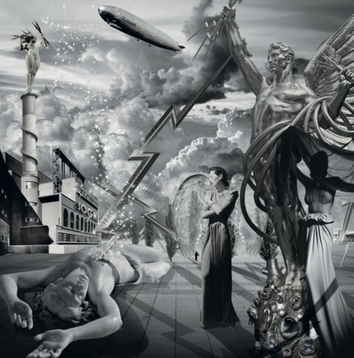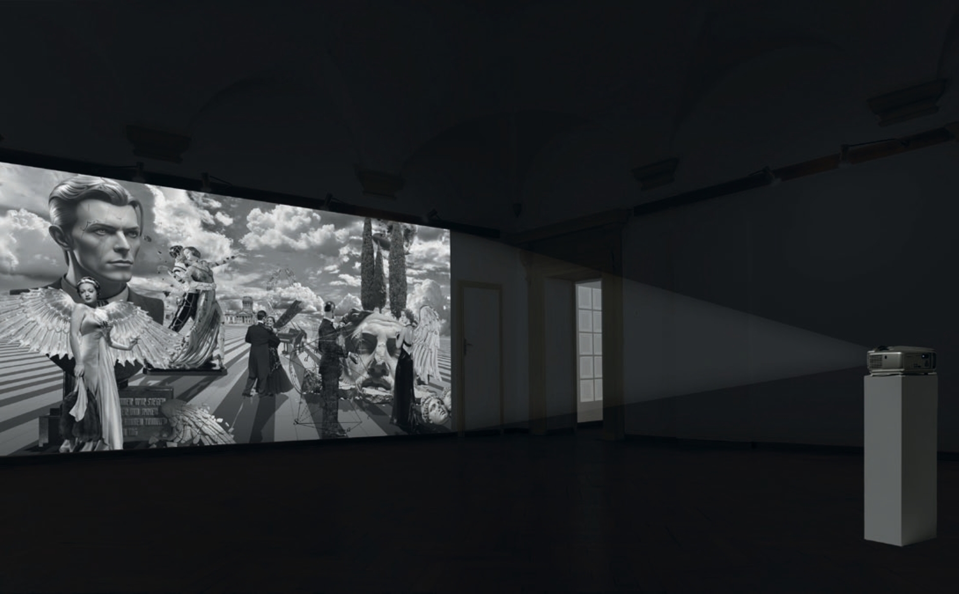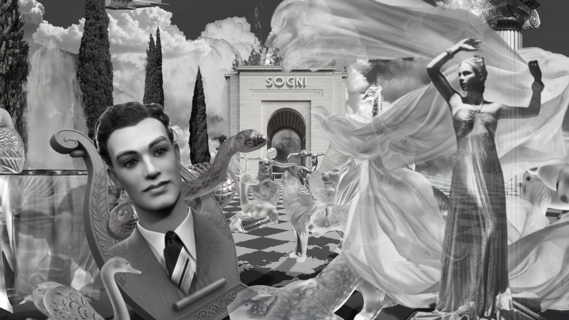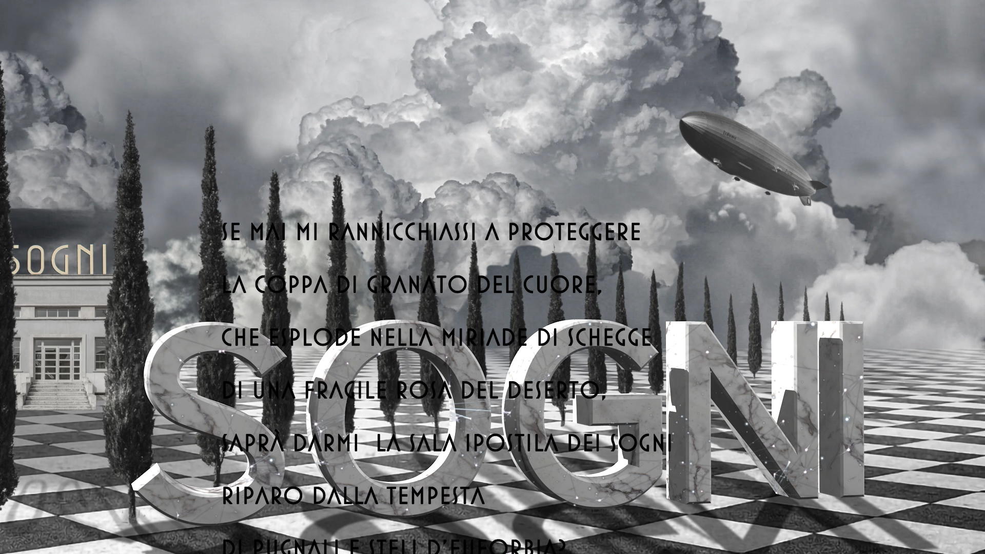 Chi va là? Ah benissimo, fate entrare l'infinito. Louis Aragon | Fabrizio Passarella Retrophuture ... Questo evento non è stato concepito come una mostra ma come un progetto articolato, una grande installazione composta da una proiezione video/sonora nella prima grande sala della galleria, una serie di disegni e opere digitali (stampe su plexiglas e lightbox) nella seconda sala e un libro di immagini e testi poetici. Assieme alla responsabile della Galleria, Patrizia Raimondi, si è concordato di esporlo per un periodo limitato per sottolinearne la caratteristica straordinaria, simile a un sogno, che non si può ripetere o prolungare. Da tempo vado infatti riflettendo su un’arte che sia più evanescente, più maneggevole, meno aggressiva; che richieda meno spazio fisico e più meditazione. Un’arte che riproduca i meccanismi mentali e percettivi. Che possa essere proiettata, trasformando lo spazio, creando un breve momento magico per poi svanire. Il progetto è la distillazione di oltre due anni di lavoro. È iniziato, infatti, quasi per caso, nell'autunno 2022, usando una bella foto di un angelo neoclassico scattata a Capodimonte per realizzare un'opera digitale. Sorprendentemente, il mondo della metafisica e del surrealismo è riaffiorato inconsciamente e in maniera junghiana, attraverso una specie di automatismo visivo in cui convenivano spunti poetici, spezzoni di sogni, visioni ipnagogiche, ricordi e immaginario retrofuturista, reperiti con una meticolosa e quasi medianica ricerca iconografica prima e poi con l’uso delle AI visive. Il carattere onirico delle composizioni - e la geniale scritta SOGNI su un edificio della “città metafisica” di Tresigallo - hanno a loro volta suggerito il titolo generale e quelli delle singole opere. È stato come tornare alla primitiva purezza del simbolo (non necessariamente da interpretare), che si rifletteva nella chiarezza di linee delle bellissime architetture razionaliste, che avevano ispirato ed erano state ispirate dalla pittura metafisica e dalla Neue Sachlichkeit. Un’uscita dal delirante ingorgo semiologico e semantico di indicazioni, slogan, false piste, ossimori orwelliani, sfacciate aggressioni visive in cui siamo sommersi. Soprattutto in un momento in cui il vecchio Titanic europeo, in piena decadenza, sembra essere sull’orlo del suo terzo (e probabilmente definitivo) suicidio nel giro di un secolo. Questa serie di lavori riflette infatti sia la dolcezza nostalgica di un futuro mai veramente compiuto che la struggente malinconia per il naufragio di un continente che sembra, da sempre, destinato a raggiungere vette vertiginose di bellezza e raffinatezza per poi divorare ciclicamente se stesso. Il tutto trasportato in un’atmosfera di penombra e di infinite fughe prospettiche, dove i personaggi mitologici vestono lamè e frac viennesi, danzando valzer fra e con giganteschi centrotavola in porcellana mitteleuropea. L’idea era di realizzare immagini che avessero come riferimento principale la poesia, soprattutto quella parasurrealista di Yvan Goll e Paul Celan, probabilmente i due più grandi poeti dell’ultimo secolo. È stato sorprendente ed affascinante vedere riemergere il Mito e le divinità classiche in maniera inattesa ma inconfondibile, quasi che l’anima collettiva d’Europa si esprimesse una specie di écriture automatique elettronica, a confermare la tesi hillmaniana secondo cui gli dèi si sono nascosti nelle pieghe del mondo moderno, o, come ben aveva compreso Gustav Jung, parafrasando l’oracolo di Delfi: CHE LO SI INVOCHI O NO IL DIO È COMUNQUE PRESENTE.