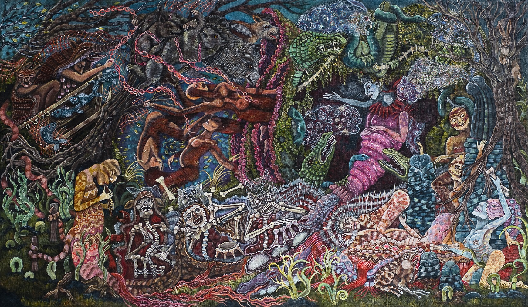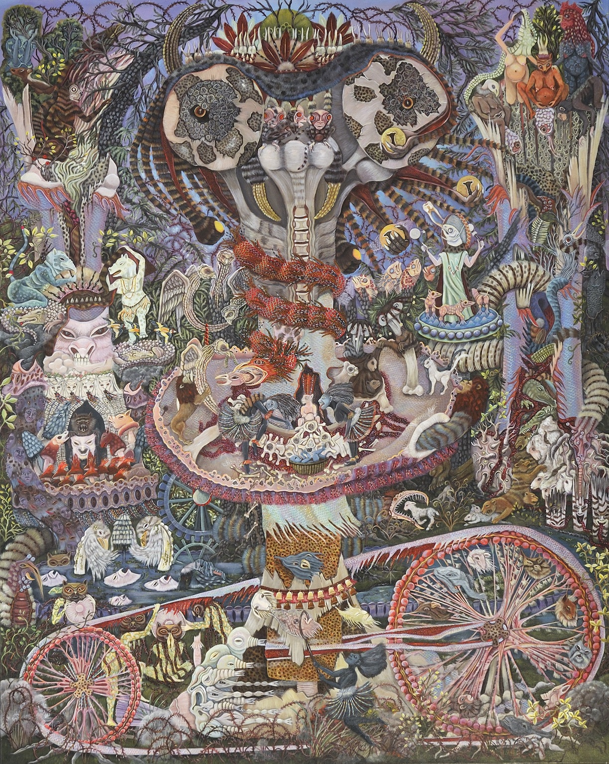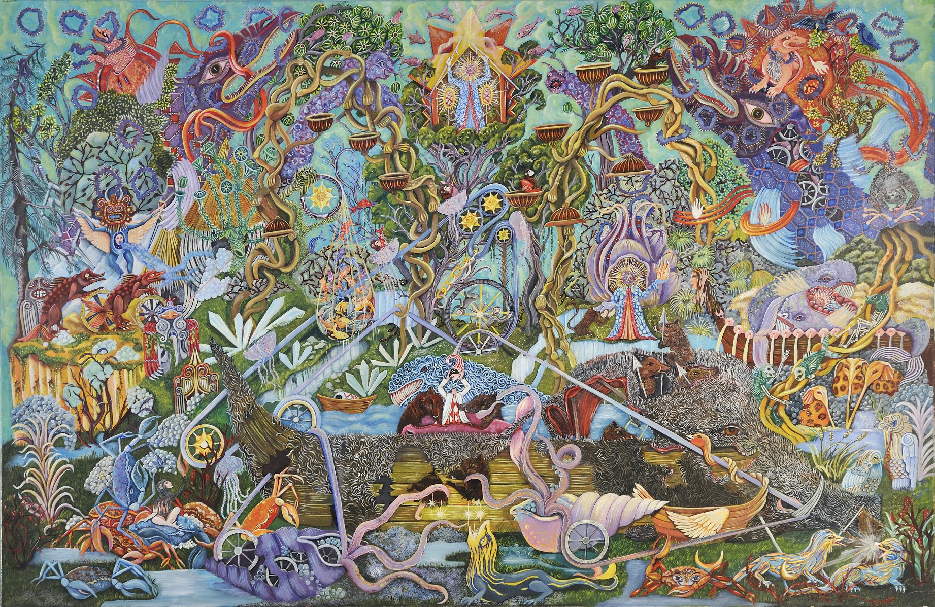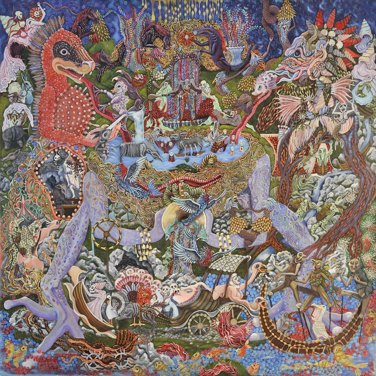 Una sorta di insolito bestiario favolistico primeggia immerso in un eden incantato ricco di simboli e di mistero che invita a un'osservazione più attenta e a una riflessione più profonda, con cinghiali, lepri, pantere, lontre, trichechi, balene, elefanti e persino, draghi e fantasmi di paesaggi leggendari attraversati da un tempo vissuto e troppo presto dimenticato. Anche i titoli delle opere come ad esempio, La denti du Mont Kad, Electricity, Equations de plumes, Fantome pour enfants hallucines, Grr’enfant sollecitano magistralmente questa particolare visione d’insolito e di mistero. Una ricerca originale e solitaria in cui dare forma all’invisibile e all’ignoto che spesso viene definita e svelata in modo dettagliato, come una preziosa miniatura fantastica e metamorfica carica di figure che quasi sempre occupano tutto lo spazio della rappresentazione. Una sorta di incessante horror vacui, non inteso semplicemente come “paura del vuoto”, ma come accumulo e affioramento condensato di presenze dell’inconscio e dell’esotico che occupano e annientano lo spazio fino a saturarlo del tutto. Una visionarietà che prosegue quella particolare linea onirica e fantastica di ricerca in quella zona limite della memoria che da Bosch porta a Redon, Gauguin, fino al Surrealismo e alle esperienze isolate e contemporanee dell’Art Brut di oggi alla ricerca del profondo e dell’alterità.