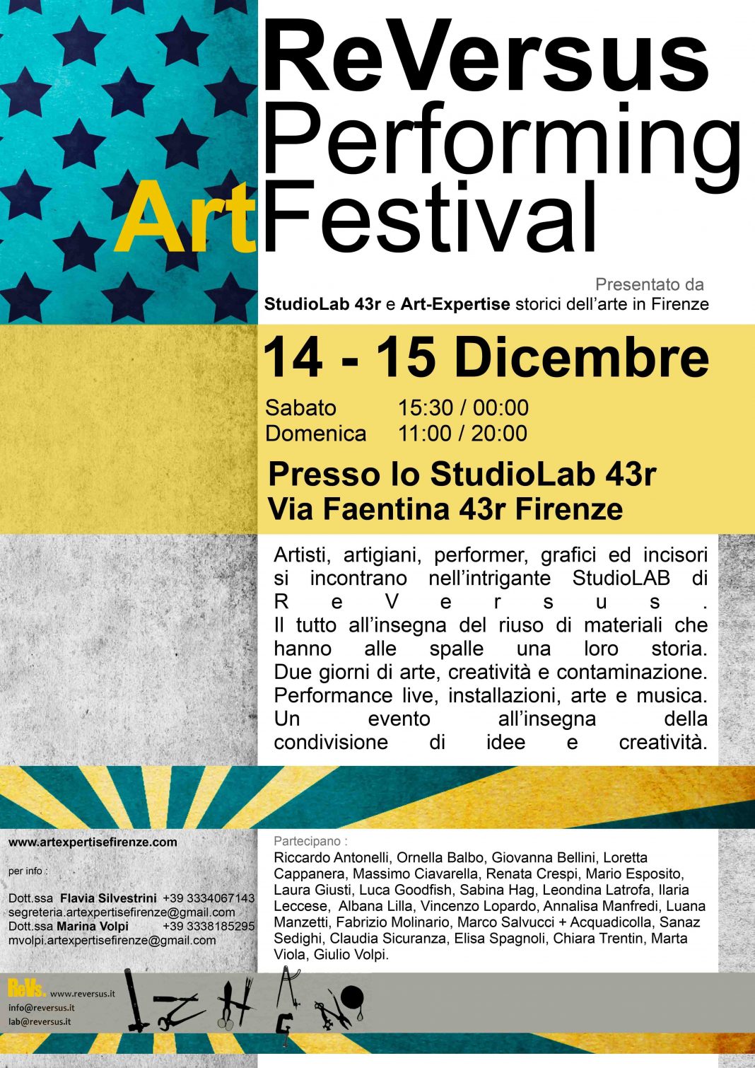 Art-Expertise presenta un gruppo di artisti, artigiani, performers, grafici ed incisori che si confronterà nell'intrigante sede di ReVs- Reversus, giovane maison di alcuni designers fiorentini che hanno fatto del riuso e del riciclo il fil rouge della loro ricerca stilistica. Il Festival dedicato alla creatività si svolgerà durante due giornate dedicate all'arte, all'artigianato ed anche a spettacoli gravitanti attorno alle varie discipline creative. Presso ReVs sabato 14 sarà possibile osservare dal vero il lavoro di pittori e scultori che si esibiranno in alcune estemporanee, sarà possibile farsi fare un ritratto sul posto mentre si sorseggia un vin brulè godendo della splendida location che ospiterà l'evento, oppure passeggiare tra vari stand dedicati ad oggetti d'arte ed artigianato che gli artisti partecipanti proporranno poi anche durante la giornata di domenica. La serata di sabato sarà dedicata ad un aperitivo con djset ed altre performances artistiche in successione.