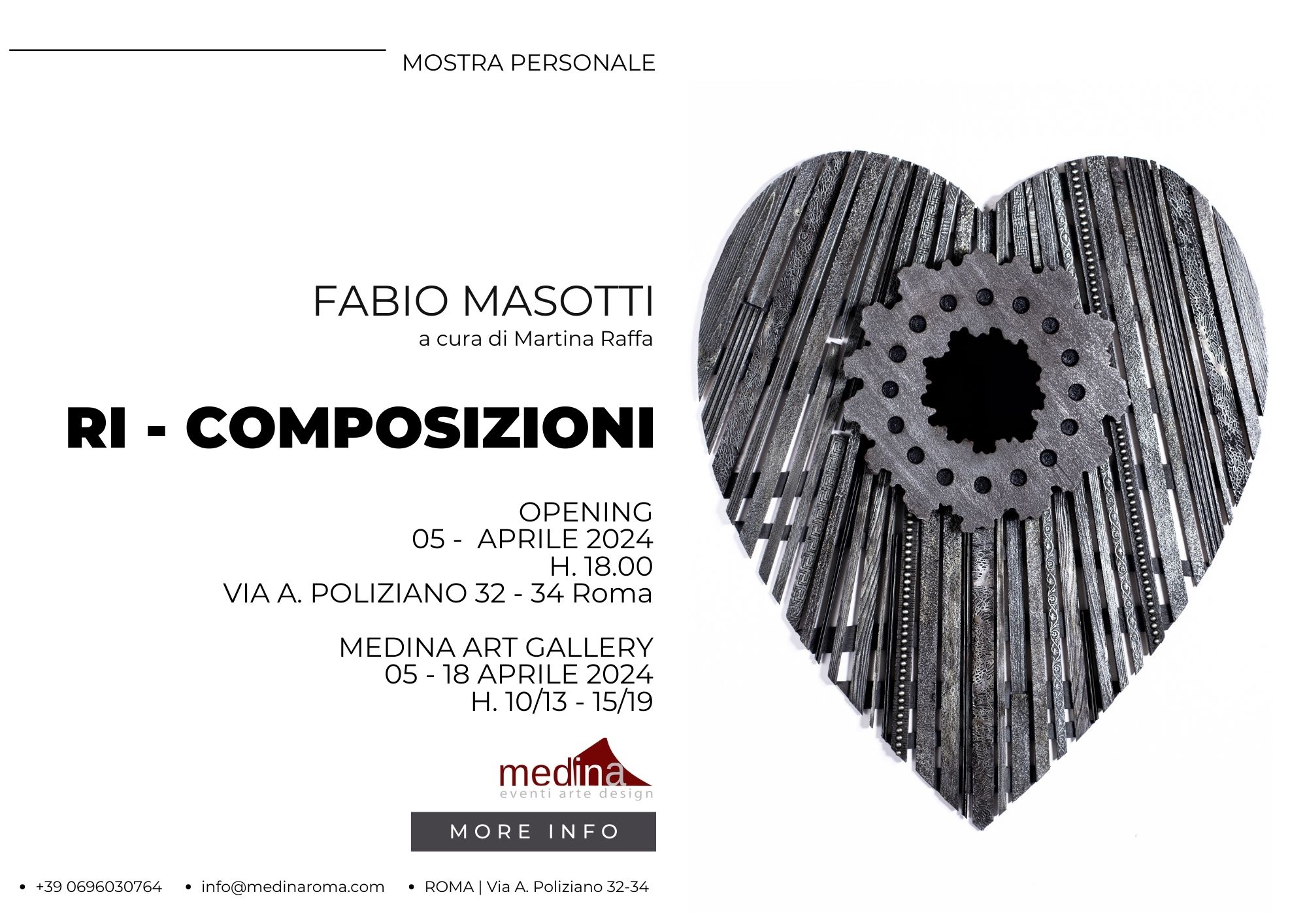 La mostra "Ri-Composizioni" propone un viaggio attraverso i filoni artistici che Masotti ha esplorato nel corso degli anni. Il concetto di rinascita, sia terrena che spirituale, è al centro di questa esposizione, ispirata dalla personale esperienza dell'artista con la malattia. Le opere presentate sono un'evoluzione delle sue riflessioni sulla vita, la morte e la trasformazione. Attraverso la pratica delle "ri-composizion i", Masotti offre una nuova vita agli elementi che compongono il cuore, simboleggiando così la possibilità di rinascere e rigenerarsi. Fabio Masotti utilizza principalmente materiali come lo zinco puro per rivestire le sue opere, conferendo loro non solo resistenza alla corrosione del tempo, ma anche un aspetto visivamente intrigante. La scelta di questo materiale non è casuale, ma riflette l'importanza che l'artista attribuisce alla durabilità e alla preservazione delle sue opere nel tempo.