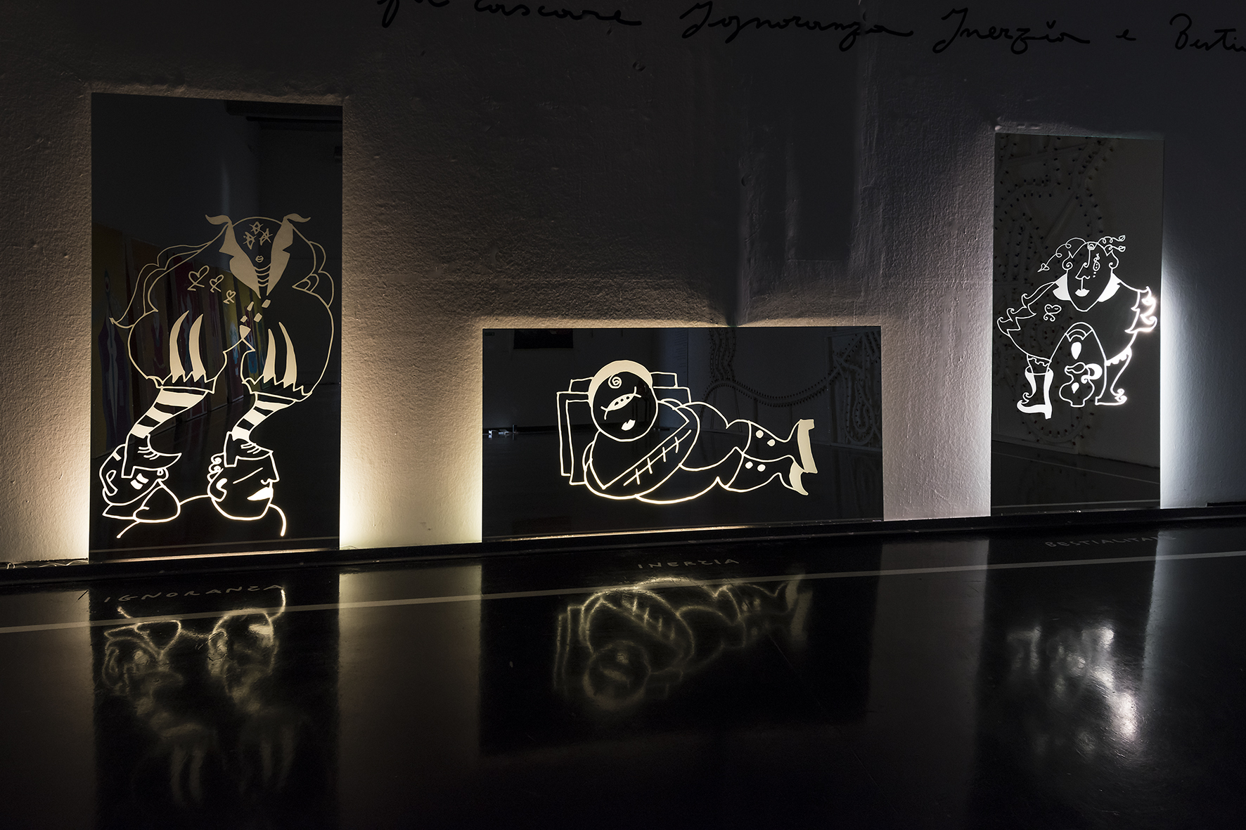 La riflessione filosofica secondo cui Giordano Bruno immagina che nel cielo vengano cacciati i vizi per far posto a nuove virtù si traduce nel percorso espositivo della mostra al piano superiore in una serie di soggetti allegorici che individuano, di contrappunto, le virtù. Qui torreggiano anche due raffigurazioni in vetro soffiato e specchiato di Murano di GB old e Mnemosyne, ispiratori del progetto artistico articolato e sparpagliato che ha avuto inizio nel 2016. Così Allegoria diventa un titolo dalle molteplici possibilità interpretative in cui lo spettatore diventa protagonista di una giocosa interazione con il mondo allegorico dell’artista.