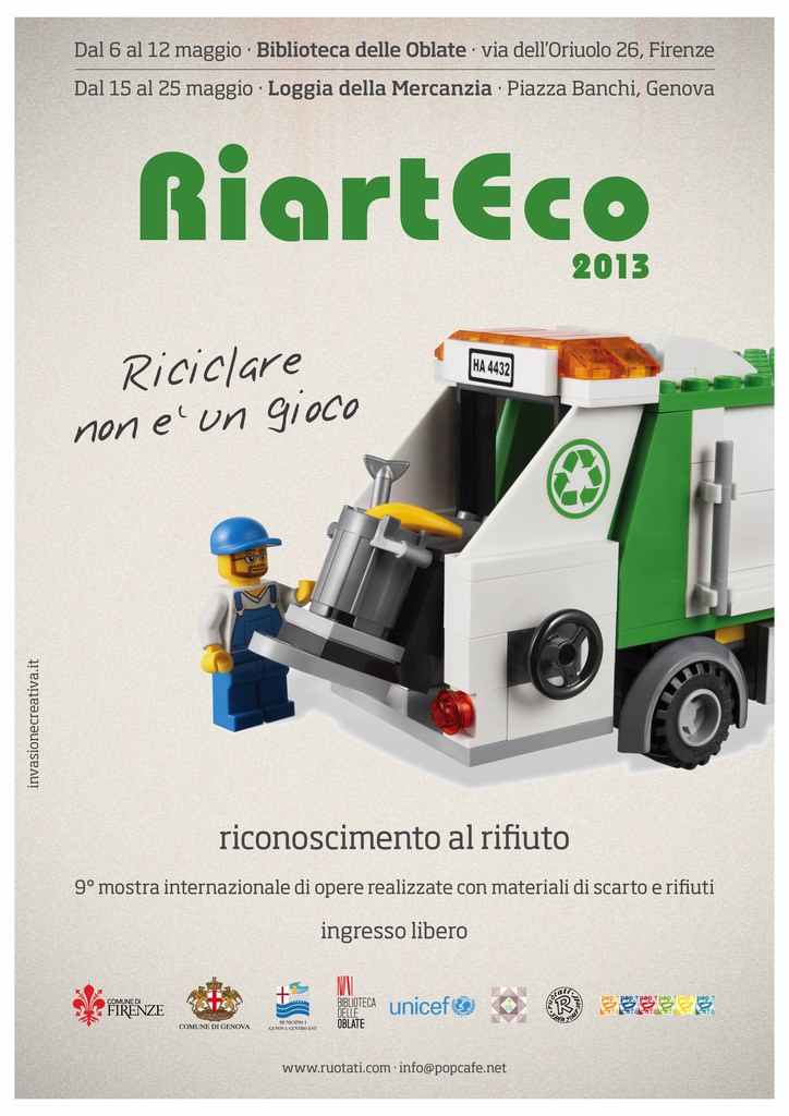 Da Firenze a Genova, il riconoscimento al rifiuto di 30 artisti provenienti da tutta Italia, a riarteco 2013, con opere realizzate da rifiuti e materiali di scarto. "l'obbiettivo spiega il presidente dell'associazione organizzatrice, la POP point of presence Marco Pasqualin – è quello di sensibilizzare i cittadini attraverso l'arte a fare meno rifiuti, consumando meglio e meno è possibile ridurre gli imballaggi. Gli artisti dimostrano un grande amore, un grande rispetto della terra semplicemente mettendo in primo piano il rifiuto donandoli un ruolo di eccellenza e di enorme risorsa." partecipano: Eleonora Mariotti, Stefania Verderosa, Roberta Gandolfi, Sergio Andrea Lagomarsino, Rossella Ricci, Raffaello Nardi, Lufer, , Irene Sarzi Amadè, Antonio Gambardella, Alessandra Guenna, Antonella Brusati, Roberto Garbarino, Benedetta Jandolo, Chiara Scaglia, Stefania Pallotta, Attilio Maxena, Alessandra Spagnolo, Carmela La Salandra by riciclando.it, Orietta Bellandi, Giovanni Baldini, Mariantonia Soncini, Francesca Ghizzardi, Paolo Lo Giudice, Rossana Chiappori, Beppe Gromi, Romina De Carlo, Mds ! , Benedetta Macini, fuori concorso Almir de Leo e Aldo Celle