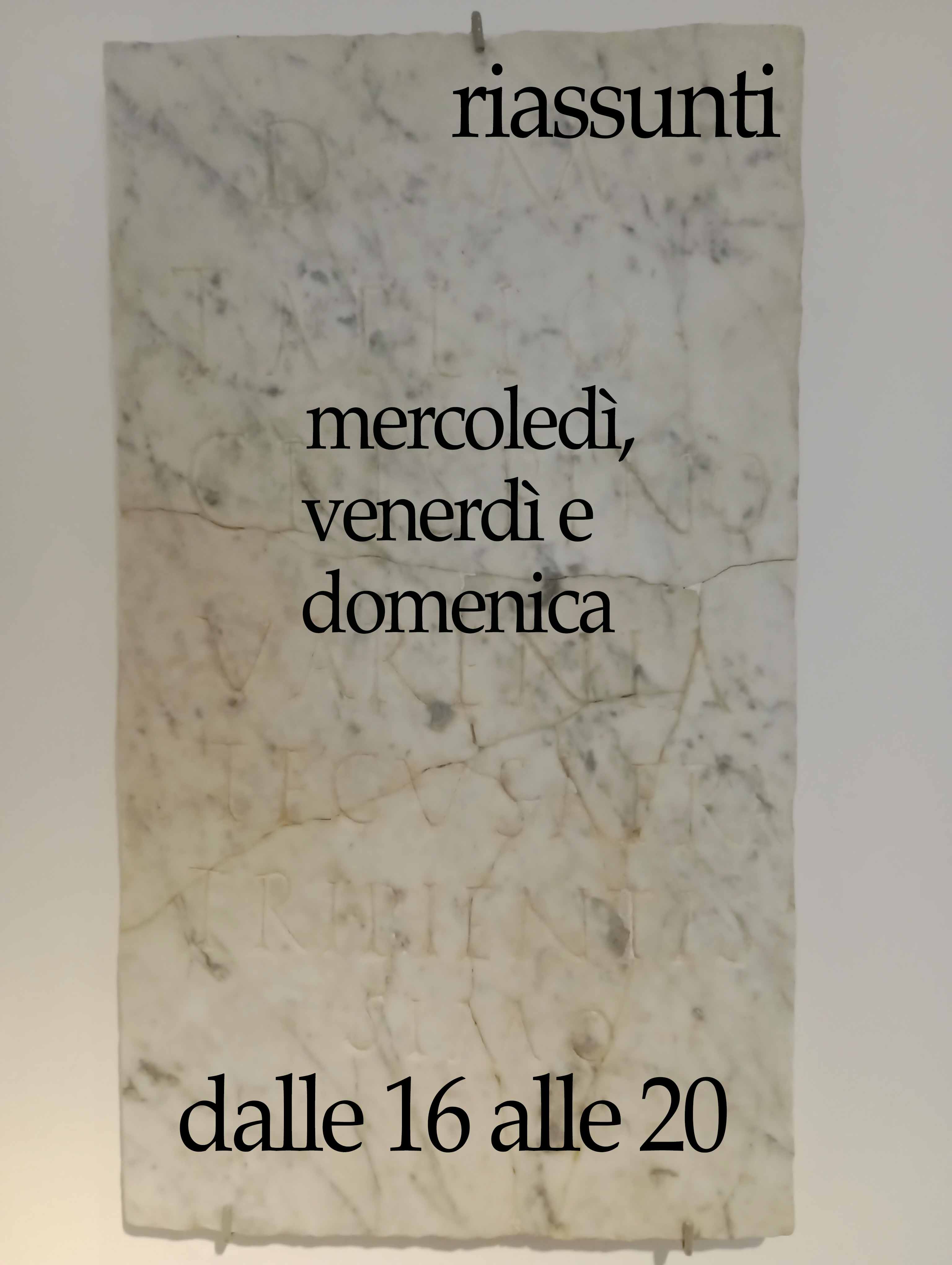 Riassunti è il primo capitolo di un progetto, il piccolo museo temporaneo can dischi. Lo spazio can dischi viene animato nei giorni di apertura da un gruppo aperto di artisti e non solo. Sculture, pitture, suoni, dialoghi e conversazioni.