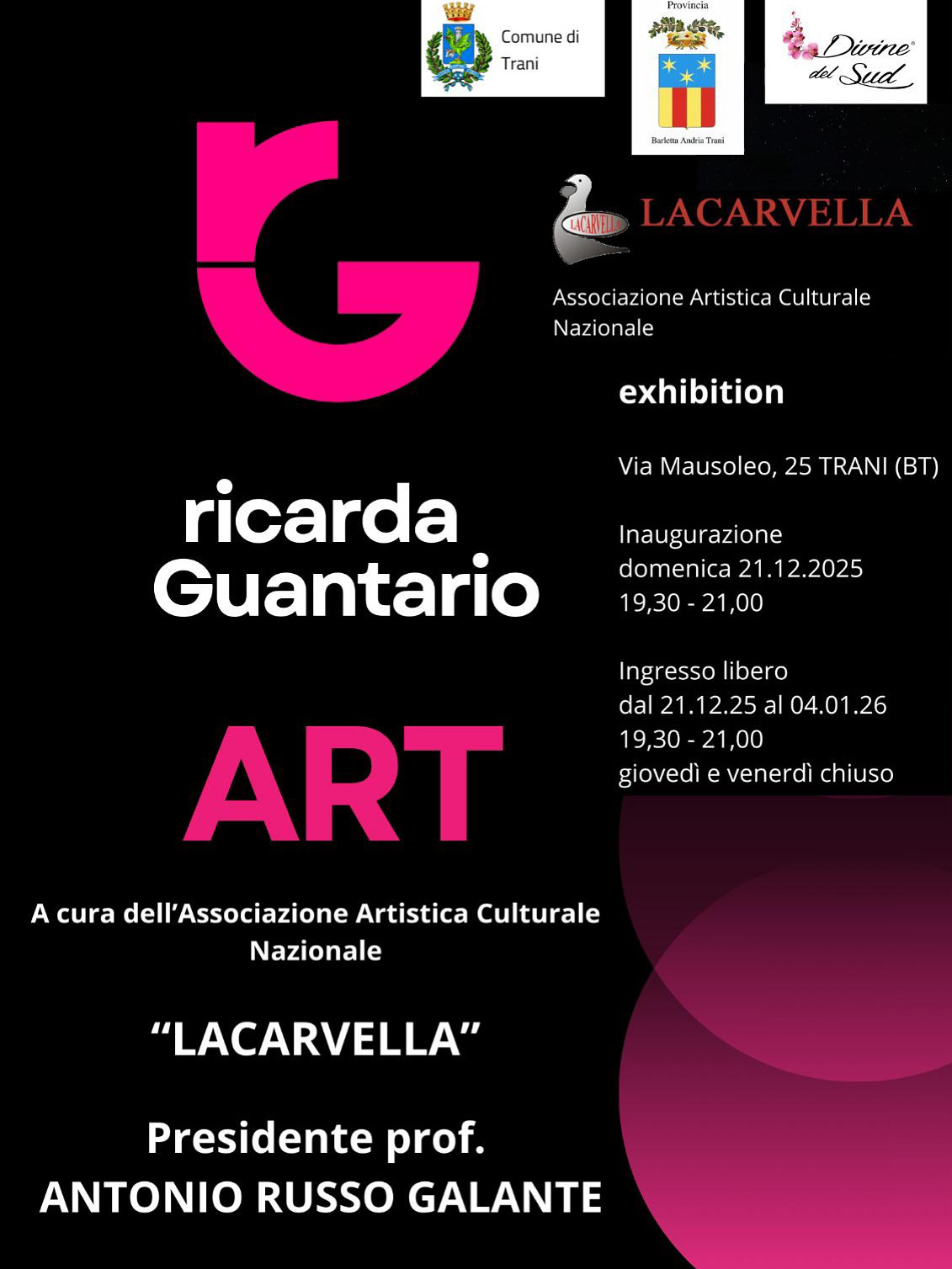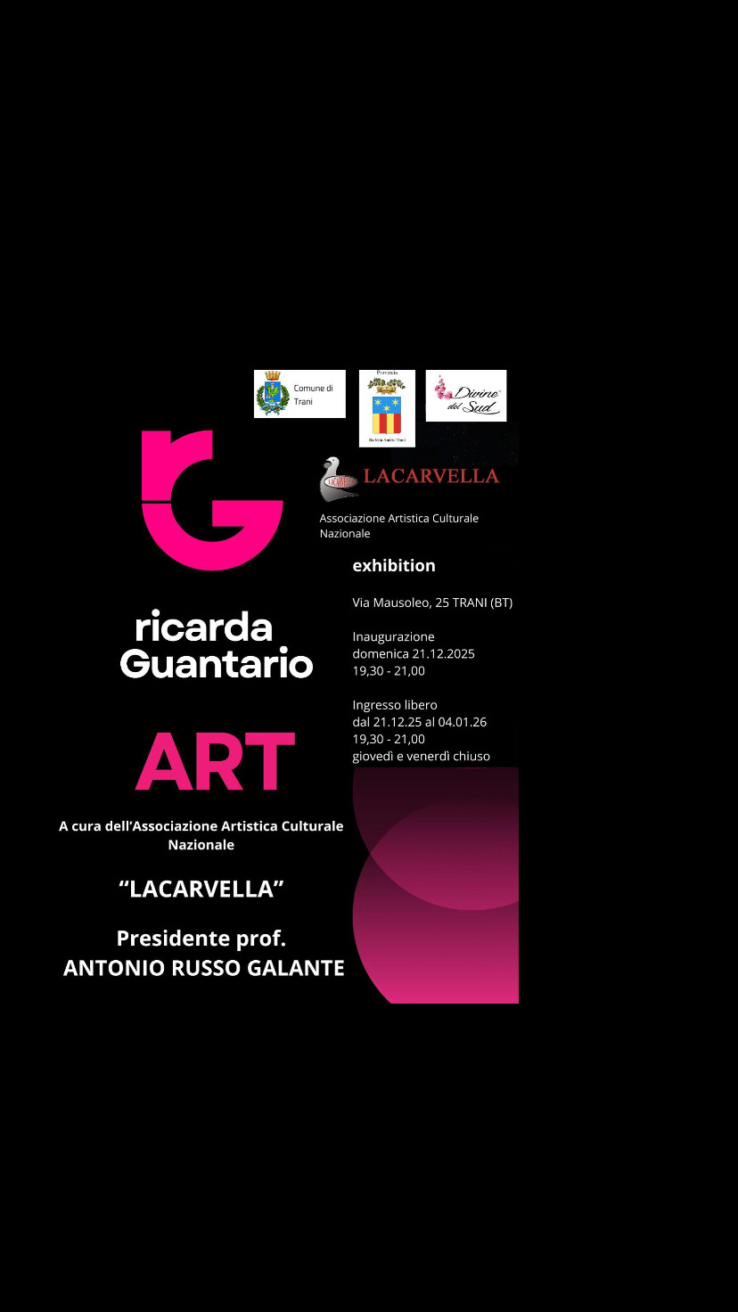 la nuova mostra dedicata all’artista Ricarda Guantario, ospitata negli spazi espositivi di Via Mausoleo 25 e promossa dall’Associazione Artistica Culturale Nazionale Lacarvella. L’iniziativa, patrocinata dal Comune di Trani, dalla Provincia Barletta-Andria-Trani e dall’associazione Divine del Sud
