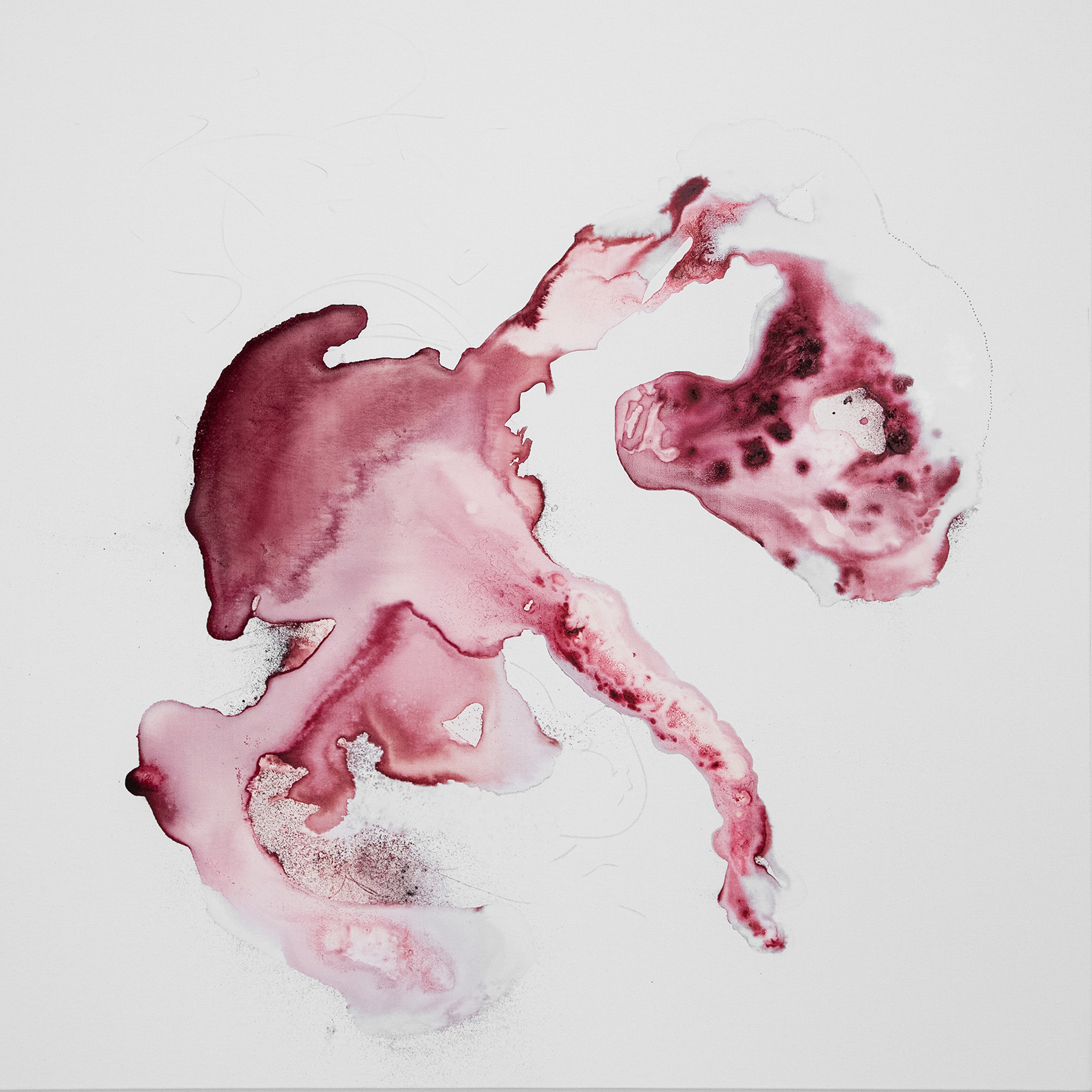 La seconda sala raccoglie invece la produzione più recente, l’approdo a una “cifra” più consapevole e identitaria attraverso l’uso di polveri naturali, pigmenti organici e acque vive, del fiume Aso e dell’Adriatico, in un processo alchemico che esprime in immagine i “tre segni dell’esistenza”: in queste opere, la pittura si rivela più che mai come un corpo instabile, continuamente esposto al tempo, alla trasformazione, all’ossidazione. Le figure emergono mai compiute, la forma si dà per frammenti, si svela e subito sfugge come una preda in fuga dallo sguardo “cacciatore” del pensiero raziocinante; volutamente ambigue, le figure sono sospese tra umano, zoomorfo e organico, tra memoria sommersa e metamorfosi, in un movimento incessante che non consente di agguantare mai una forma definitiva, conducendo piuttosto oltre la superficie visibile, dove materia e spirito si confondono, restituendo allo sguardo la fragile potenza dell’impermanenza.