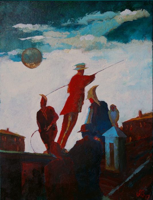 I suoi dipinti, dunque, tutti ispirati alla vita, ci portano in atmosfere ai limiti dell’assurdo, in fatti che si collocano ai confini o in bilico tra verità e finzione, sogno e realtà, in dimensioni ultraterrene, rarefatte e sospese, in mondi che spesso sembrano dominati da spiriti esoterici. Pittura ricca di simboli e significati e dove i personaggi, spesso travestiti e ricoperti da maschere, sono comparabili ad attori senza copione alla disperata ricerca di una parte.