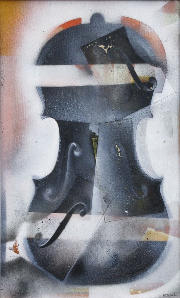 La forma del violino è il nucleo dal quale si sviluppano combinazioni in continuo divenire: forma sondata, sperimentata, scomposta nei suoi elementi costitutivi, infine di nuovo assemblata, seguendo percorsi tracciati da punti di vista contrastanti, “alla Braque”, e secondo piani sovrapposti. La tela, dipinta a smalto, è lo scenario in cui i caratteristici tagli del violino, a forma di “effe”, si cercano, si specchiano, si inseguono, sprofondati nell’atmosfera vaporosa ottenuta attraverso la stesura cromatica.