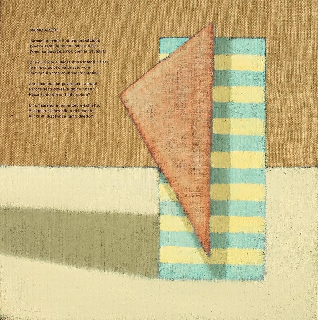 La mostra vedrà esposte undici nuove opere che rappresentano l’evoluzione concettuale del pittore, evoluzione legata in particolare alla “Poesia Visiva” ; questo evento è dedicato al poeta Giacomo Leopardi, rappresentato dall’opera “Il Primo Amore”, Canti (1818).