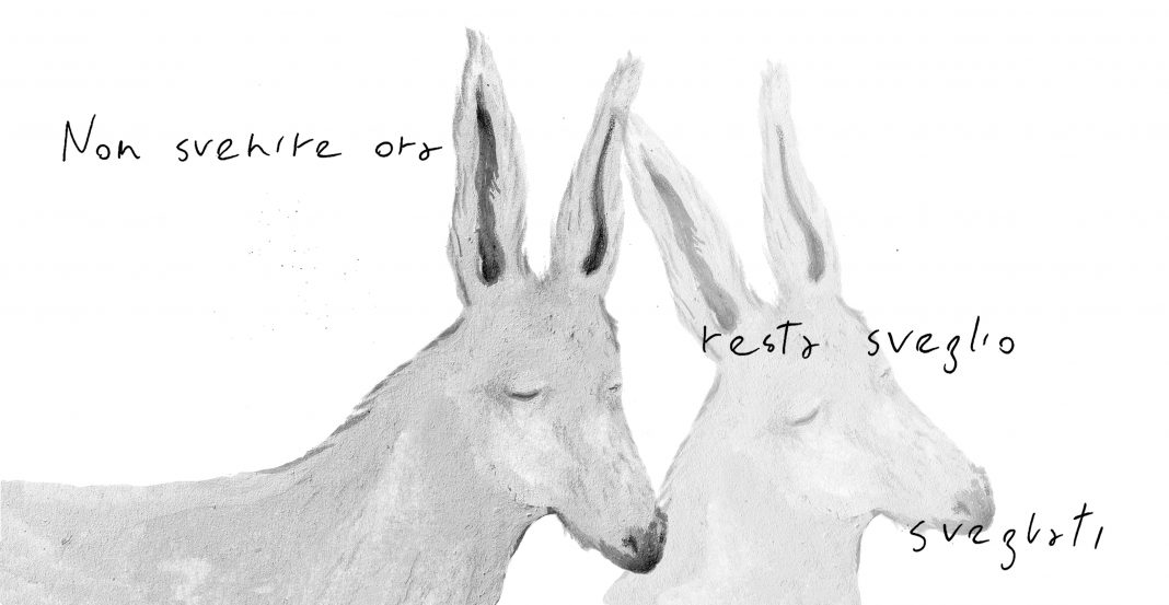 “Resta sveglio svegliati” nasce dalla collaborazione tra Riccardo Frolloni, poeta e direttore dello Spazio Letterario di Bologna, e l’artista dell’Accademia di Belle Arti Valeria Cavallone; un dialogo a sei mani curato da Adiacenze che interverrà attivamente sui disegni preesistenti di Daniele Catalli. Nell’ottica di una partecipazione attiva e condivisa dell’opera, “Resta sveglio svegliati” è un tentativo di poesia visiva, una sovrascrittura narrativa in chiave pittorica.