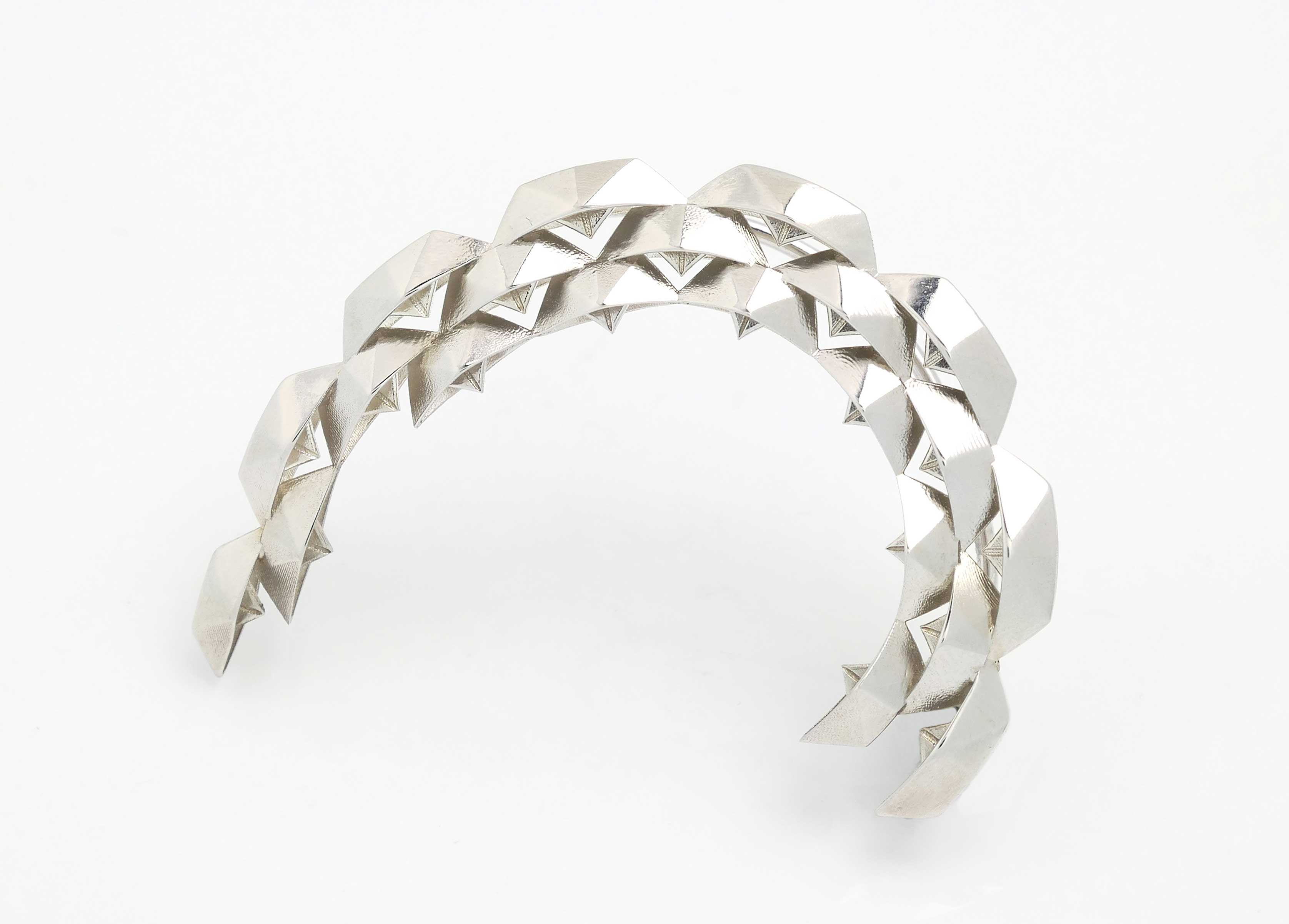 Nei gioielli creati da Gusmaroli ritroviamo la stessa ricerca del contrasto luci-ombre, pieni-vuoti, azione-non azione, questa volta impreziosita dai nuovi materiali con cui queste forme sono plasmate nella loro variante da indossare.