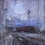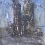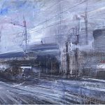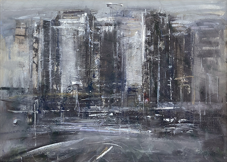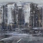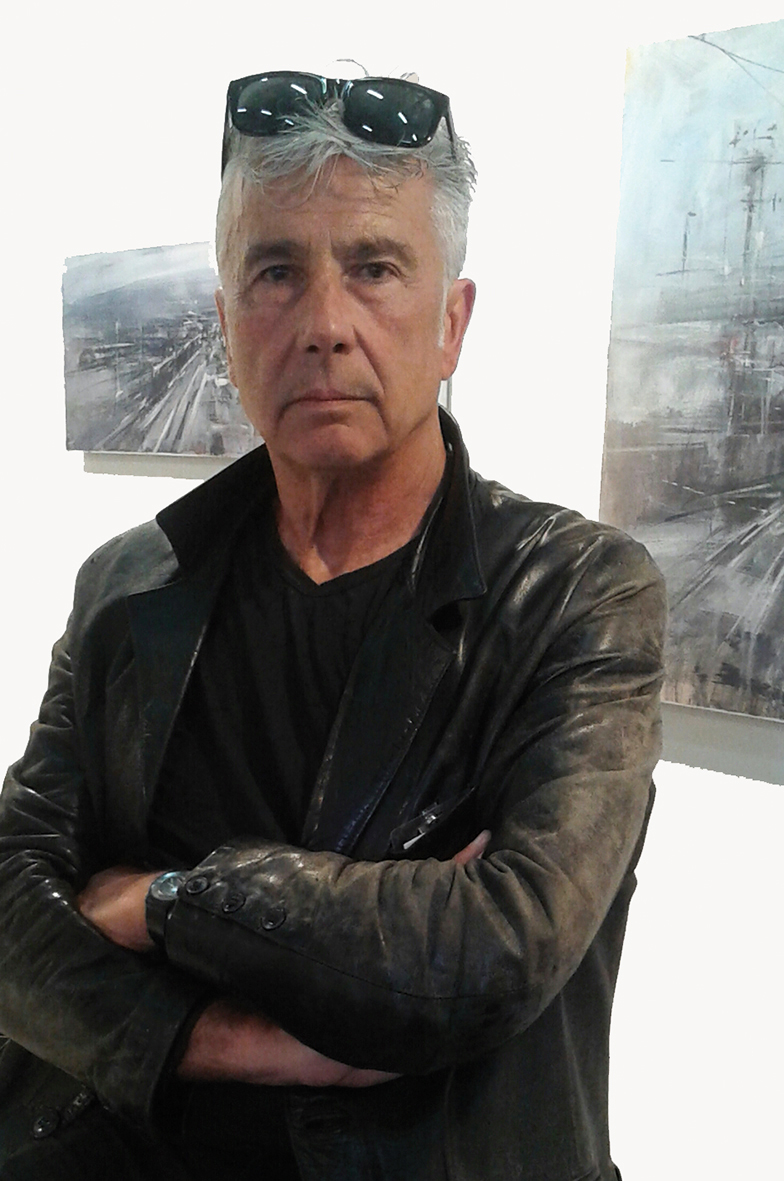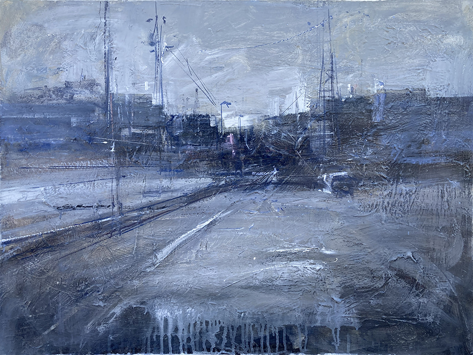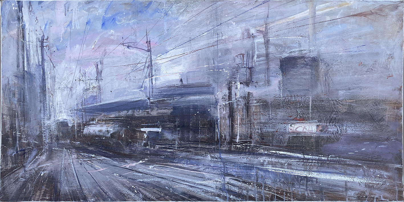 Alle pareti sono esposti una selezione di dipinti eseguiti di recente: paesaggi urbani, strade, ponti, case e binari “morti” di ferrovie…