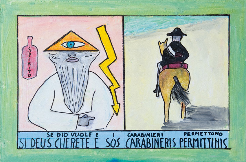 Il titolo della mostra è un aforisma sardo (Si deus cherete e sos carabineris permittinis) che Riccardo Notarbartolo ha preso in prestito per intitolare uno dei quadri esposti. E' una frase ironica e spiritosa che mette in luce una metodologia tipicamente italiana per concludere un qualsiasi affare o progetto. Se si vuole che questo si compia bisogna allargare il consenso al maggior numero di enti o persone possibili. Non basta la decisione della divinità suprema se non c'è il consenso di un'altra divinità anch'essa reputata suprema.