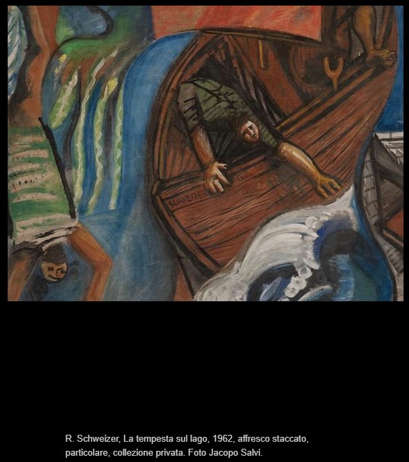 La mostra si propone di riportare a casa la monumentale La tempesta sul lago, opera di alto significato per il contesto gardesano, realizzata da Riccardo Schweizer nel 1962 come decorazione della hall dell’Hotel Ideal di Limone sul Garda. Dopo aver salvato l’affresco dalla ristrutturazione dell’edificio, l’opera è stata custodita presso la Fondazione Bruno Kessler a Trento e finalmente ritorna nell’ambiente per cui era stata concepita.