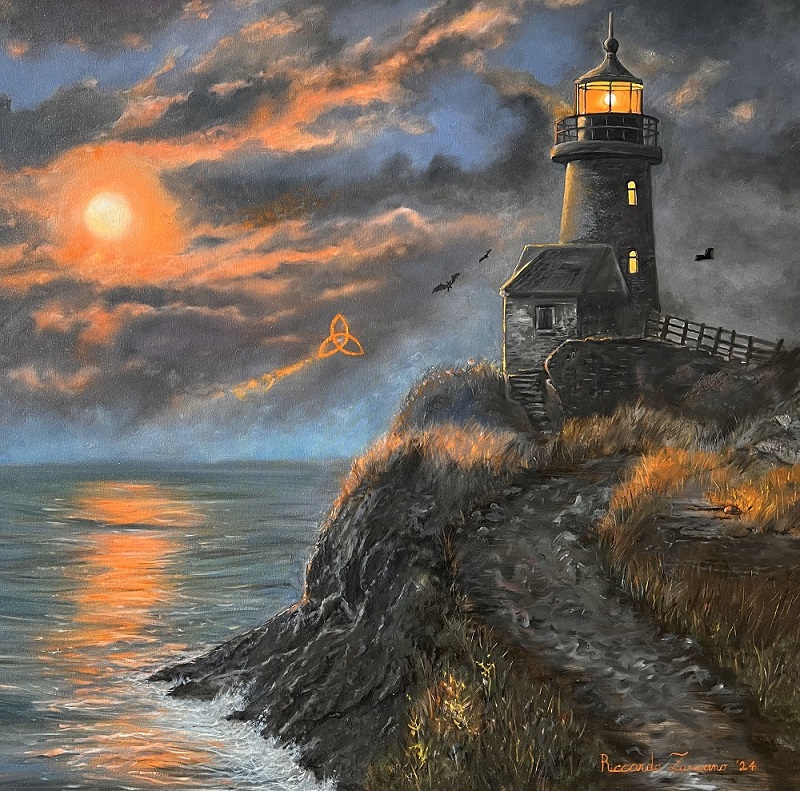 La tela raffigura un faro che emerge imponente tra onde tumultuose, mentre una tempesta si scatena sotto un cielo dai colori vividi, dominato da lampi elettrici e tonalità drammatiche di rosso e viola. Nel dipinto del Maestro Zancano, inoltre. l’arte pittorica si fonde con l’uso sapiente di pietre semipreziose, arricchendo l’opera con dettagli unici. Una acquamarina, trasformata nella spada dell’Arcangelo, emana una luce eterea nel cielo tempestoso. Un frammento di agata bianca diventa una piccola sezione del fulmine, accentuando il dinamismo della scena. Infine, un pezzo di legno fossile silicizzato è inserito nella prua della nave, donando realismo e profondità storica. Questi elementi, abilmente mimetizzati nei colori del dipinto, arricchiscono la composizione con eleganza e simbolismo.