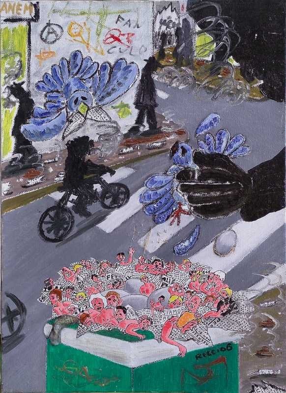 E' vero, sembra la narrazione di un espressionismo volto al negativo, destinato all'infelicità, eppure nelle opere del Riccio quella sua vitalità perfino chiassosa, quella propensione al grottesco ci restituiscono una visione limpida, tutt'altro che assuefatta e moribonda, proprio come la racconterebbe un bambino o un extraterrestre che avesse vinto un week-end a Milano. Un po' come Novecento, il pianista di Baricco, se si fosse deciso a scendere a terra, quello stupore che l'avrebbe accompagnato ad ogni passo nelle strade ordinarie, dove invece niente si ripete per davvero, quando si vive con gli occhi bene aperti.