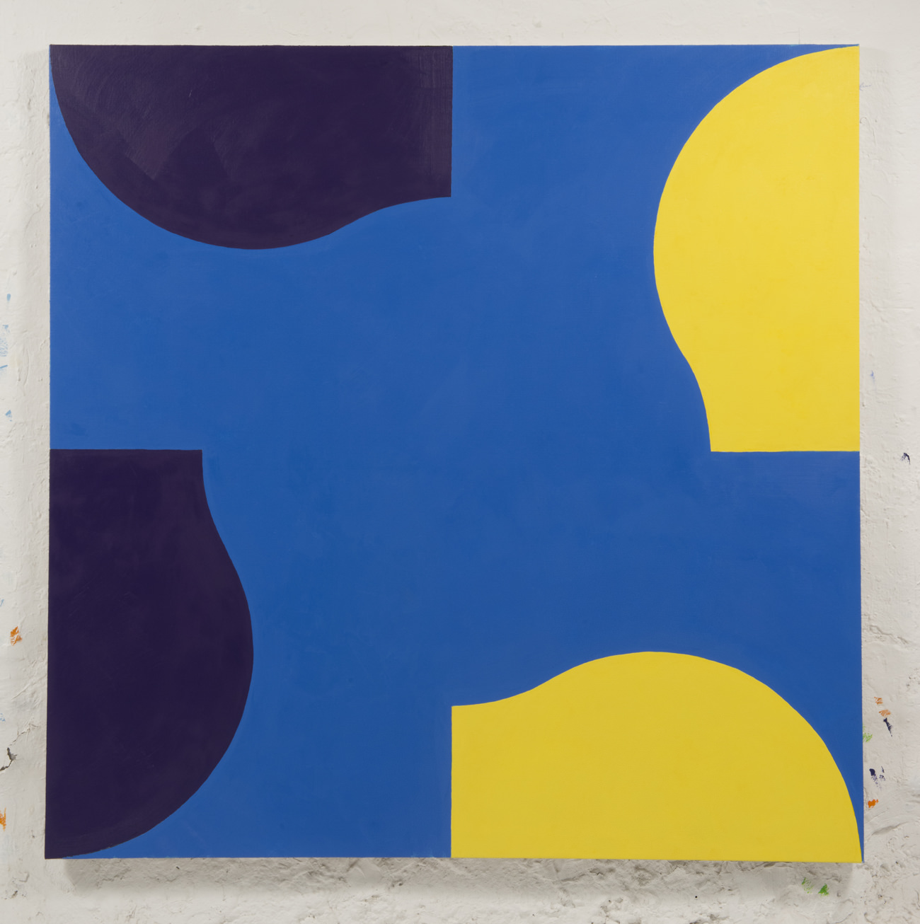 "Il carattere KAN (間) è essenziale nella lingua giapponese e ha una vasta gamma di significati. Il più comune è spazio, intervallo, distanza. Tuttavia non è riferito esclusivamente allo spazio fisico ma anche al tempo, con il significato di pausa, sospensione, attesa. Il titolo della mostra, KAN (間), identifica la nuova serie di dipinti, dopo la serie KIN in cui le forme si congiungono a formare una figura scultorea centrale. Perciò, per non ripetermi e per posizionarmi al di fuori da quell'angolazione ho spostato le forme piatte al di là del centro, fino al limite della tela e oltre il i confini del quadro.