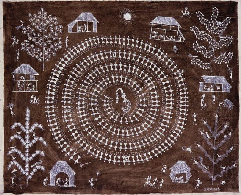 La tribù warli vive a circa 150 chilometri da Mumbai (ex Bombay) e ancora oggi parla una lingua di cui non esiste forma scritta. È famosa per le sue pitture murali, raffiguranti sia spiriti soprannaturali che scene di vita quotidiana. Sono dipinti eseguiti interamente in bianco, applicando una miscela di pasta di riso, acqua e gommoresina, che funge da legante, sulle pareti color terracotta delle capanne, anch’esse costruite con i materiali più semplici: rami, argilla e sterco di mucca. Un bastoncino di bambù viene usato come “pennello” per tracciare i motivi, basati soprattutto sulle figure del cerchio, del triangolo o del quadrato. Di regola questi dipinti vengono eseguiti esclusivamente in occasioni cerimoniali: la celebrazione di un matrimonio, la festa del raccolto... Jivya Soma Mashe è stato il primo a uscire dai confini di questa pratica rituale, non solo dipingendo ogni giorno, ma tracciando i suoi motivi anche su tela.
