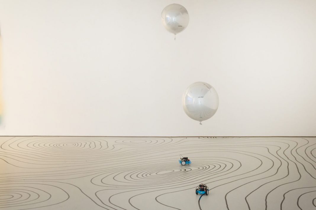 L’installazione di Richard Loskot “Like a Cork on the Water” consiste di due piccoli robot. I robot muovono lungo le loro curve di livello. Ogni robot ha, a diverse altezze, una nuvoletta con un testo. È un’allegoria di due persone viste da due posizioni diverse. È un astratto gioco ambientale.