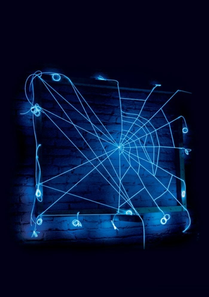 I lavori presentati in galleria nascono dalle riflessioni dell’artista sulle potenzialità creative offerte dall’utilizzo della luce nera, o luce di Wood, modulata sulla struttura della ragnatela, eccezionale esempio in natura di “organizzazione geometrica e architettonica” : da qui nascono i tracciati luminosi , sui quali luce e il buio, abilmente veicolati nello spazio e nei limiti da essi creati, stimolano suggestioni visive sempre nuove.