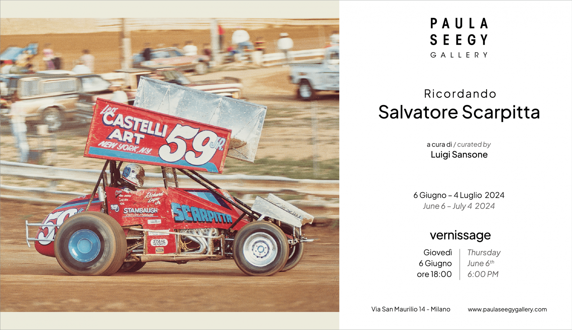 Presso la Paula Seegy Gallery giovedì 6 giugno alle ore 18 inaugura la mostra “Ricordando Salvatore Scarpitta” a cura di Luigi Sansone. L’esposizione, aperta al pubblico da 6 giugno al 4 luglio, offre un corpus di 27 opere, fra cui sculture, disegni, stampe, manifesti, fotografie, prove d’artista, che illustrano alcuni momenti salienti del percorso artistico di Salvatore Scarpitta. Dai suoi lavori emerge l’imprescindibile passione per il mondo delle auto e delle corse automobilistiche, che lo ha accompagnato costantemente nel corso della sua vita e che rappresenta un elemento cardine del suo fare arte.