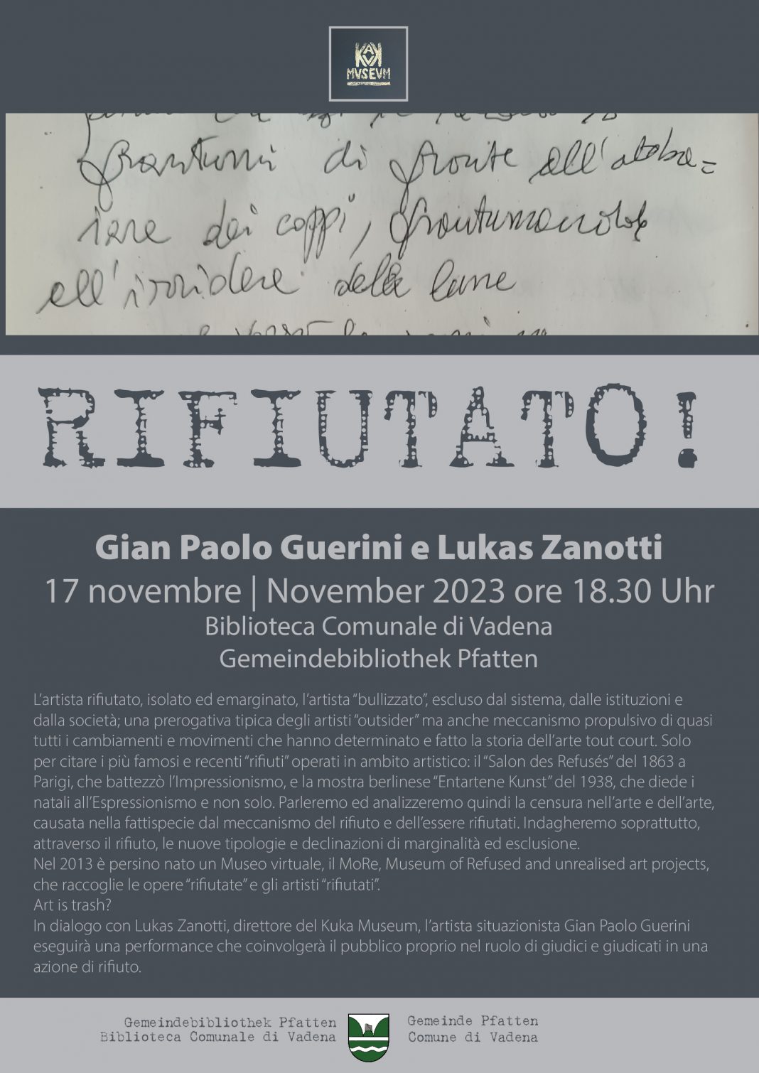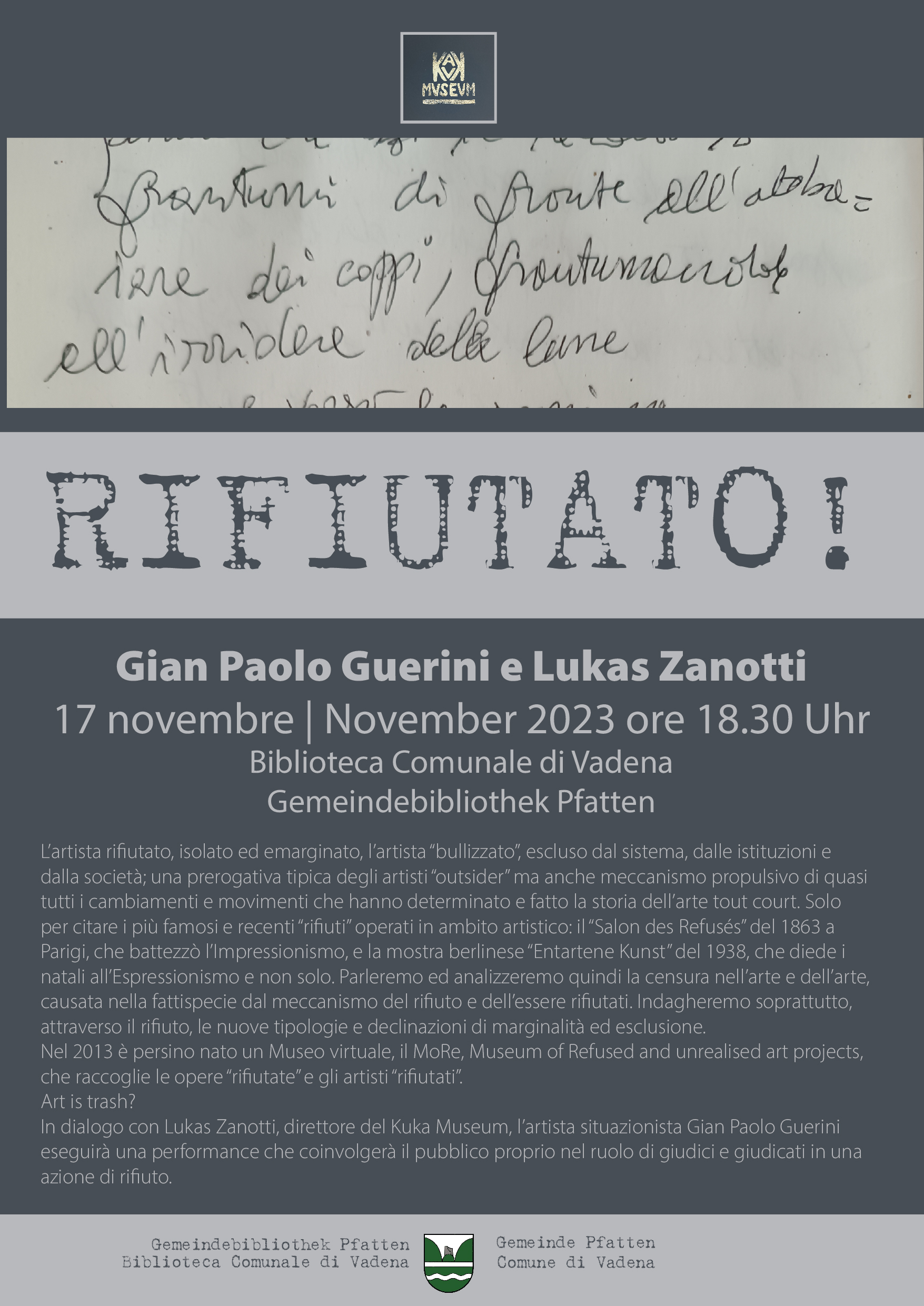 In dialogo con Lukas Zanotti, direttore del Kuka Museum, l’artista situazionista Gian Paolo Guerini eseguirà una performance che coinvolgerà il pubblico proprio nel ruolo di giudici e giudicati in una azione di rifiuto.