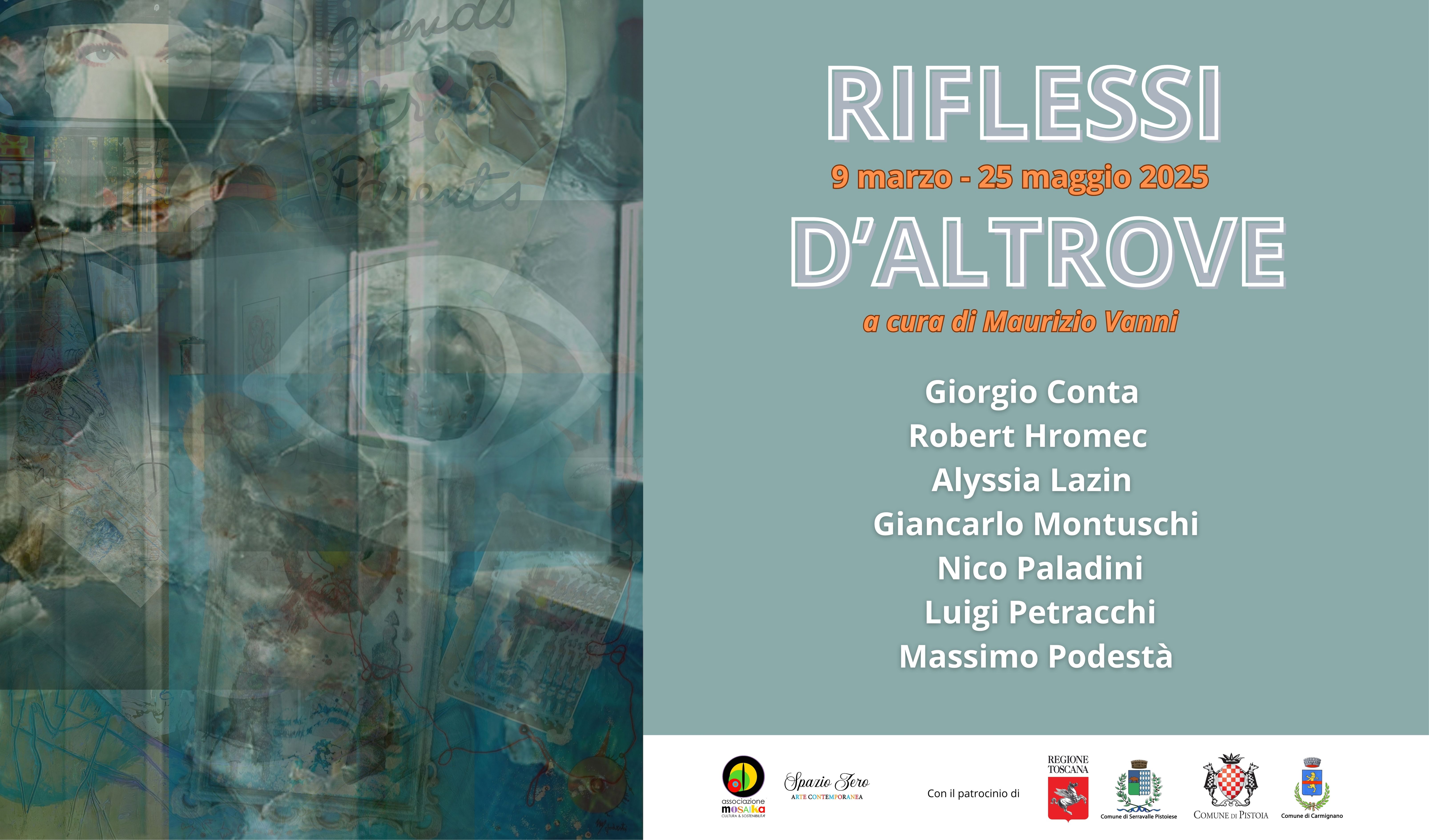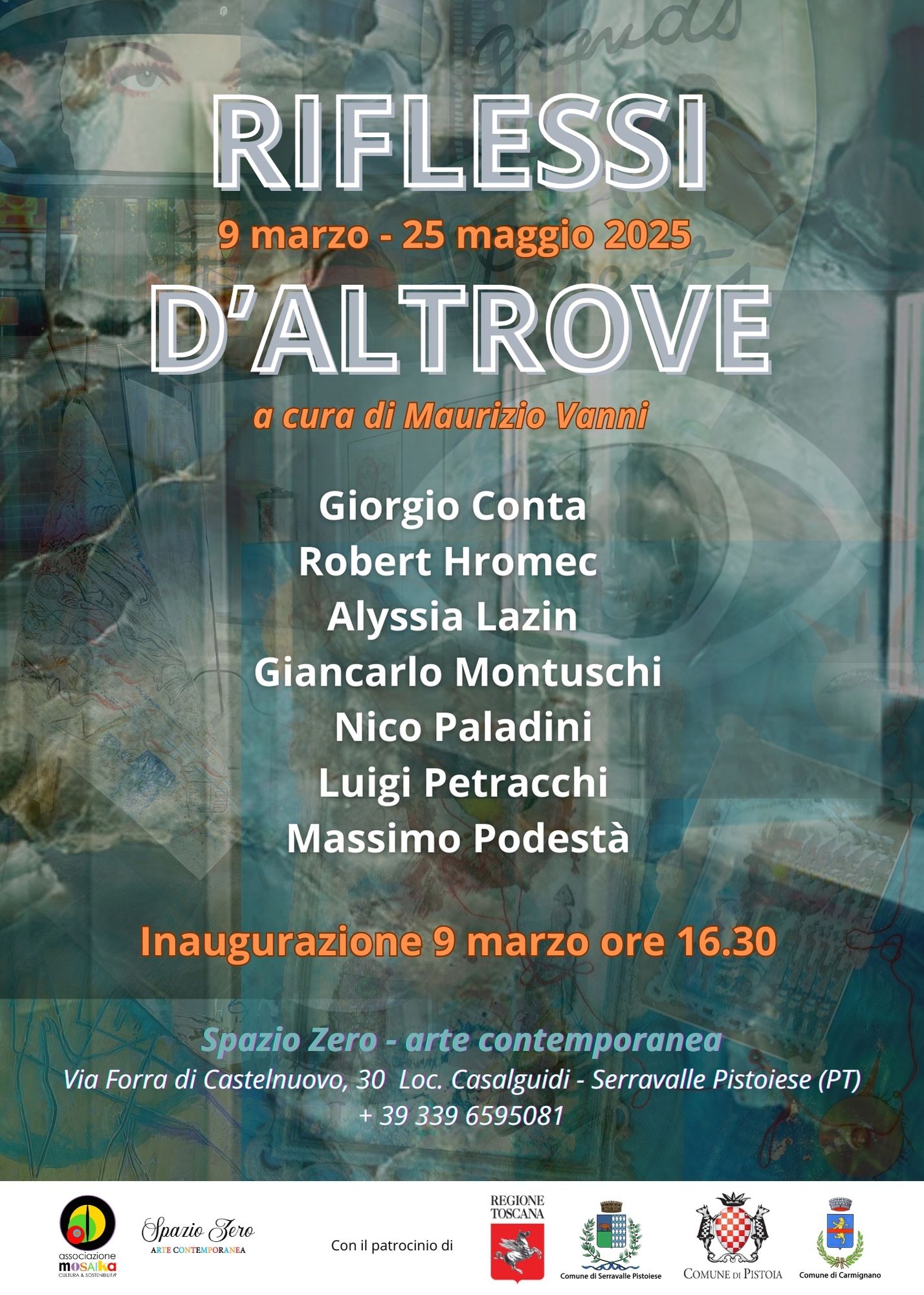Dal 9 marzo al 25 maggio 2025 Spazio Zero - arte contemporanea propone la mostra “Riflessi d’altrove”, curata dal museologo e critico d’arte Maurizio Vanni, con le opere di Giorgio Conta, Robert Hromec, Alyssia Lazin, Giancarlo Montuschi, Nico Paladini, Luigi Petracchi, Massimo Podestà che sono stati chiamati a confrontarsi sul tema dello specchio e del suo riflesso. L’inaugurazione si terrà domenica 9 marzo alle ore 16,30.