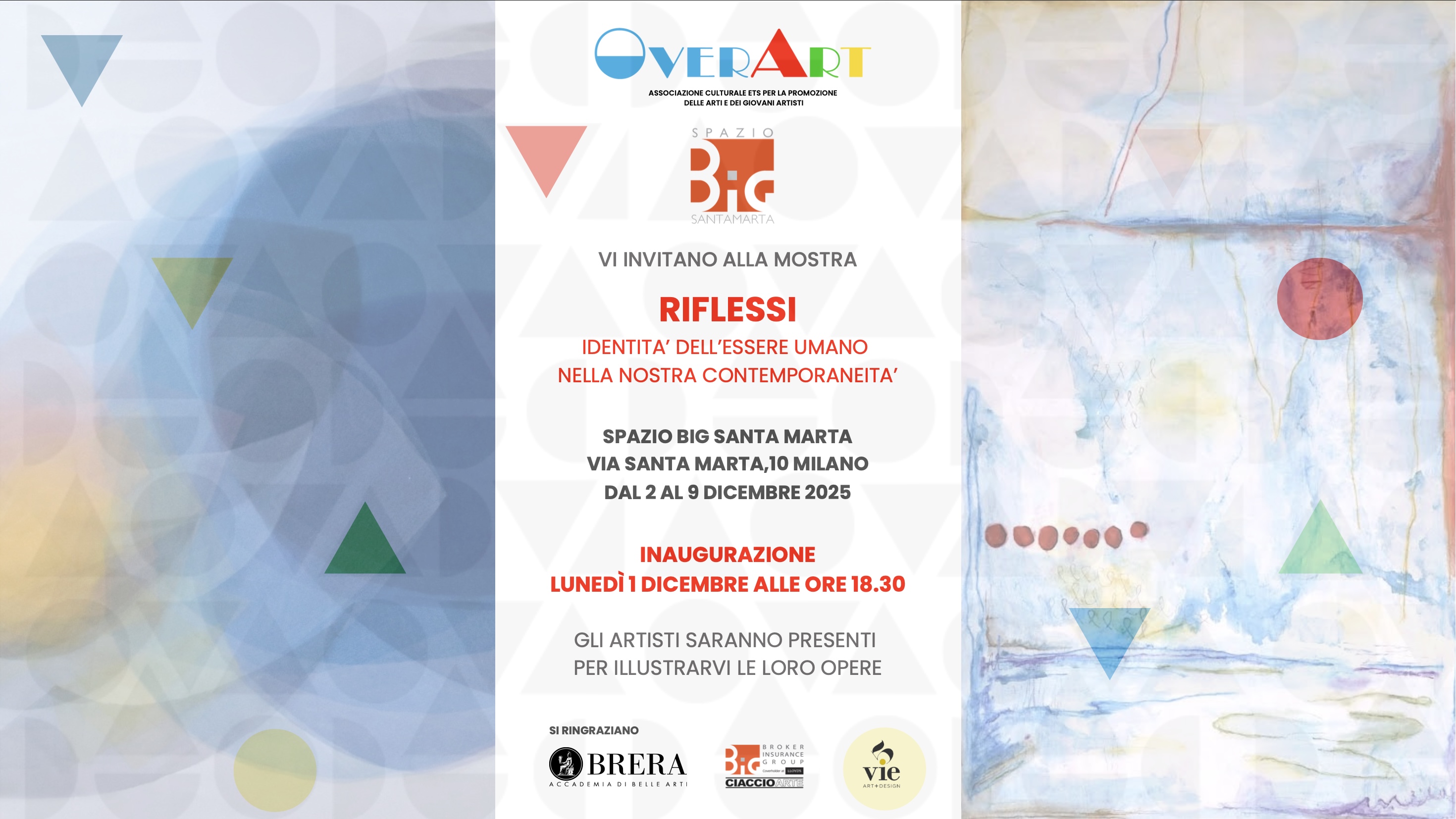 Lunedì 1 dicembre, alle ore 18.00, presso lo SPAZIO BIG (via Santa Marta 10, Milano), verrà inaugurata la mostra RIFLESSI, con opere di giovani artisti, allievi ed ex allievi dell’Accademia di Belle Arti di Brera, a cura dell’Associazione Over Art.